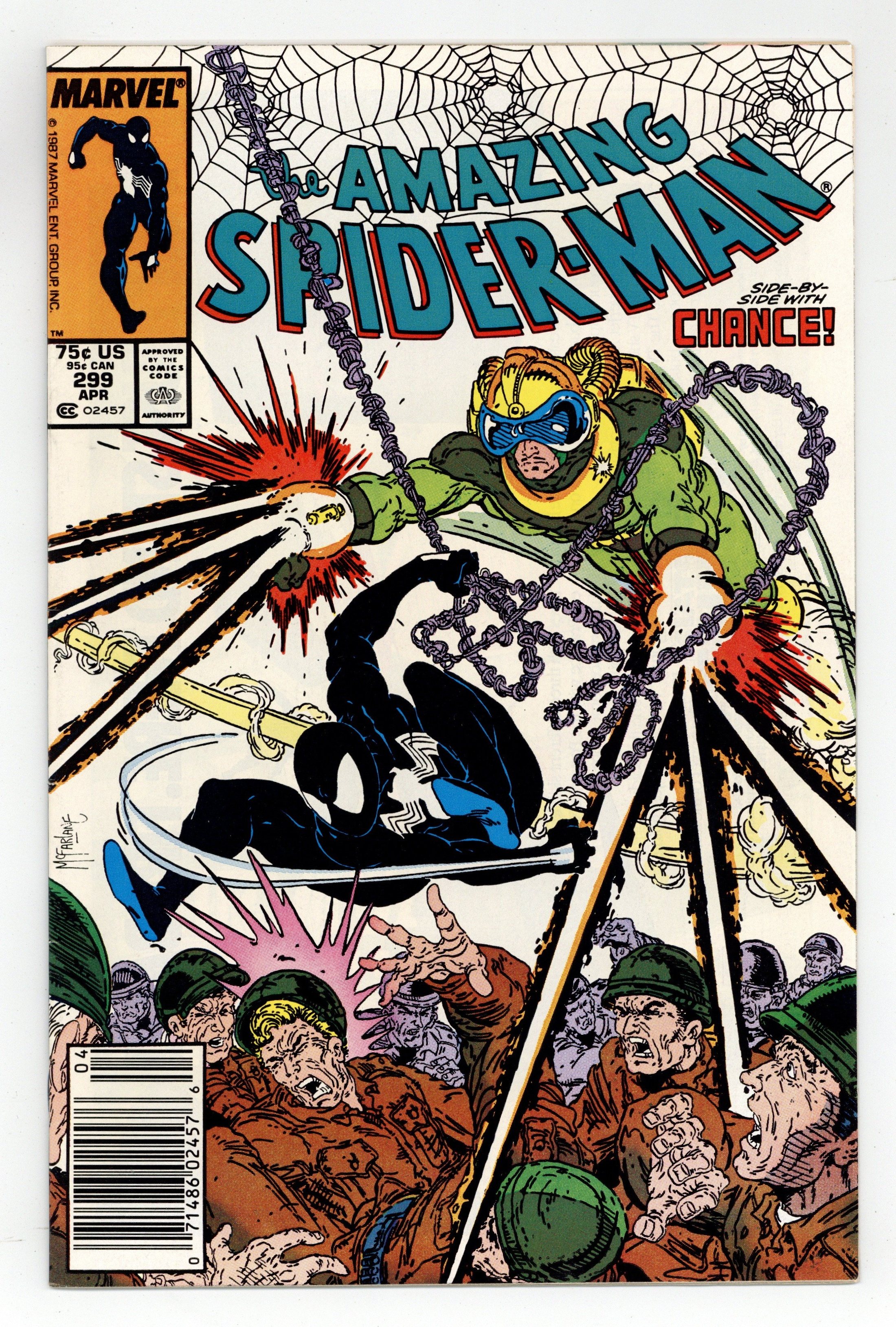 Starts Mar 23 Newsstand Edition. "Survival of the Hittist!" Part 2 of 2. Script by David Michelinie. Pencils by Todd McFarlane. Inks by Bob McLeod. Cover by Todd McFarlane. After their waterfront arms theft goes awry, the Life Foundation turns the tables on Chance! The mysterious survivalist group abducts the mercenary and takes him to their secret headquarters in northern New Jersey! But thanks to a well-placed spider tracer, the web-slinger infiltrates the foundation's secluded colony the next day...and rescues Chance! So now the adversaries of 24 hours ago suddenly become allies to avoid death...courtesy of the Life Foundation! First appearance (and cameo on the last page) by Venom. Cameo appearances by Eddie Murphy, Paul Schaffer, and Joe Robertson. Last 75¢ issue. 36 pages, full color. (Note: Chance returns in Amazing Spider-Man 336.) Cover price $0.75.