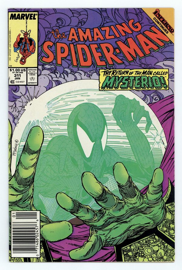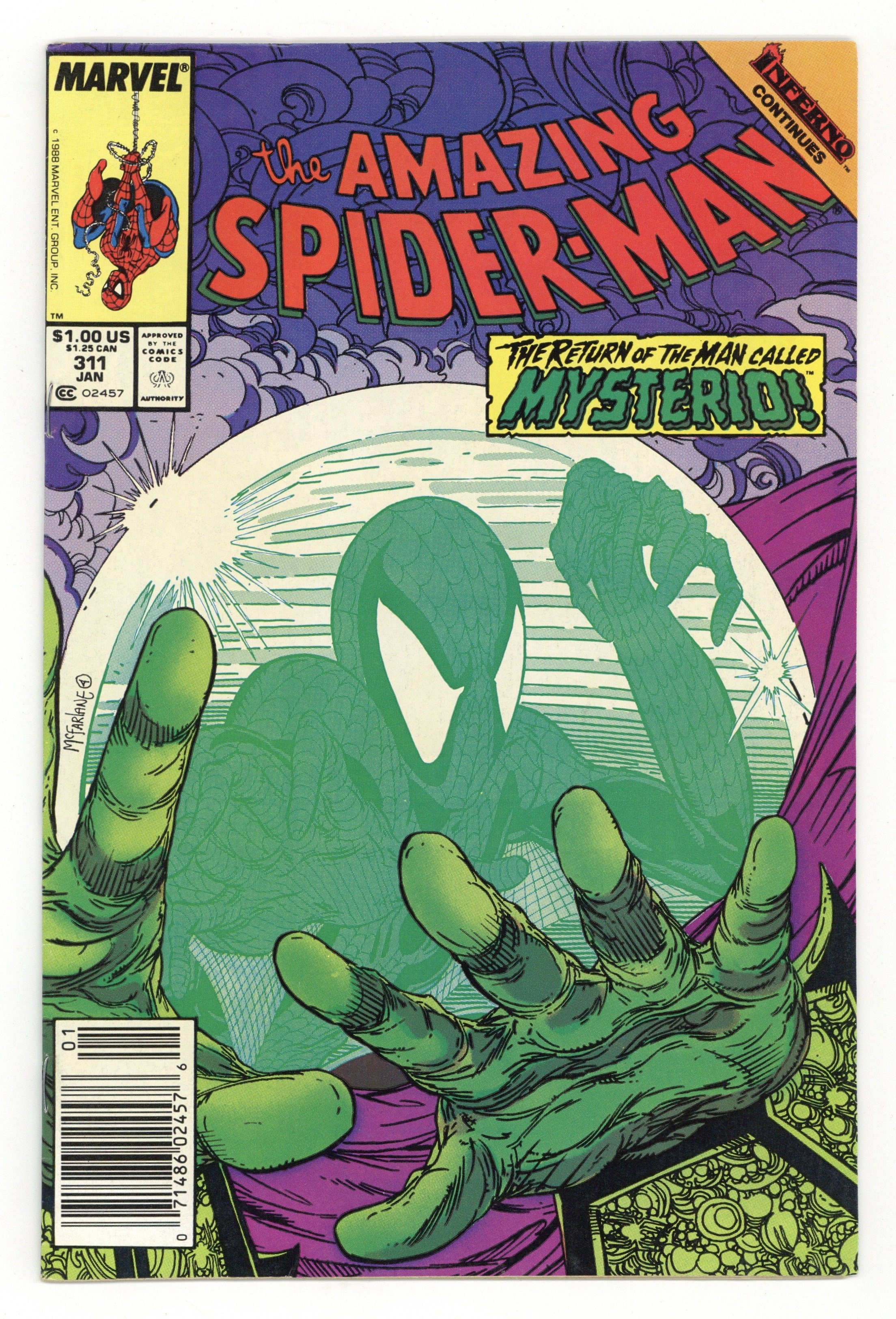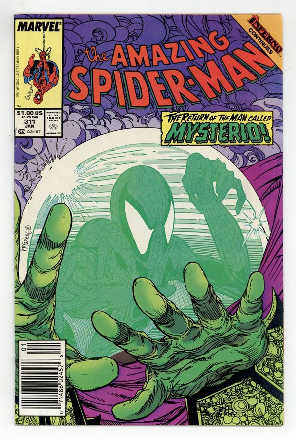 Tags: Spider-Man$21.00Newsstand Edition. "Mysteries of the Dead" Inferno crossover. Script by David Michelinie. Art by Todd McFarlane. Cover by Todd McFarlane. Crazy things are happening in the Big Apple as a result of Inferno! When a brick building comes to life and crushes an innocent bystander, the wondrous wall-crawler is devastated that he couldn't save the poor man. However, the next day when he returns to the same location, the web-slinger senses a mystery. Or perhaps better stated...Mysterio! Under the cover of Inferno, the Master of Illusion attempts to wreak havoc on Spider-Man's life! Can the spectacular one see through the mist and fog and solve (the) Mysterio? Appearance by Mary Jane Watson. Cameo appearances by Dr. Curt Connors, Harry Osborn, Liz Osborn, Normie Osborn, and the Hobgoblin. (Notes: Elements of the story continue in Spectacular Spider-Man 146.) 36 pgs. Cover price $1.00.