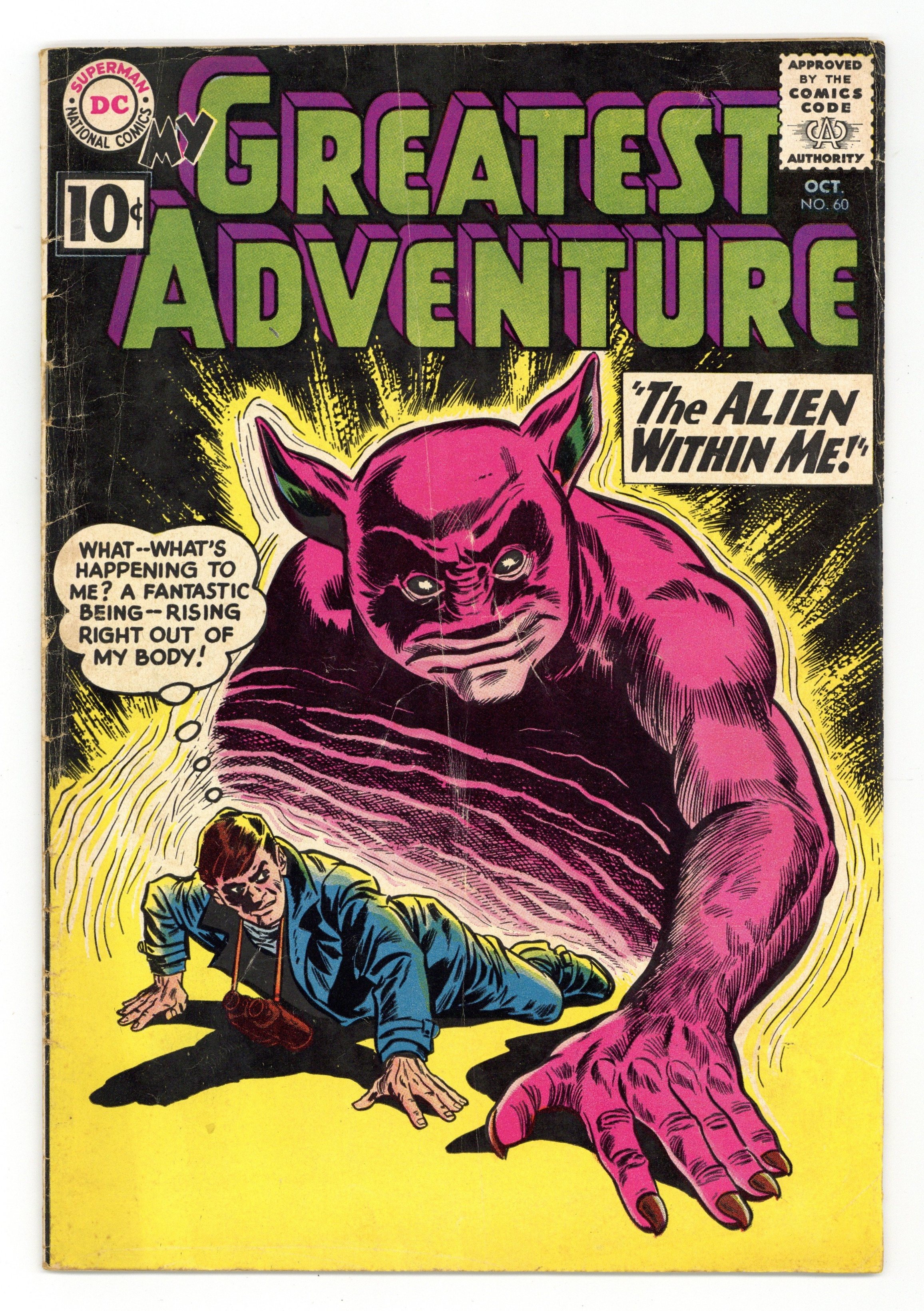 Cover pencils by Dick Dillin, inks by Sheldon Moldoff. I Lived in Two Worlds, art by Ruben Moreira; Police detective Russ Overton is pursuing a dangerous criminal when a strange bolt of lightning splits him into two beings, and catapults one of them into another dimension. Ad for Showcase #34 (first Silver Age Atom), pencils by Gil Kane, inks by Murphy Anderson. The Monster That Changed Our Lives, art by George Roussos; A giant robot rampages through a town and the people who encounter it face critical decisions. Ad for Secret Origins #1. I Defied the Desert Phantom text story by Jack Miller. The Alien Within Me!, art by Alex Toth; An alien sends his image to Earth to stop a bomb sent here by his race. 36 Pages, Full Color. Cover price $0.10.