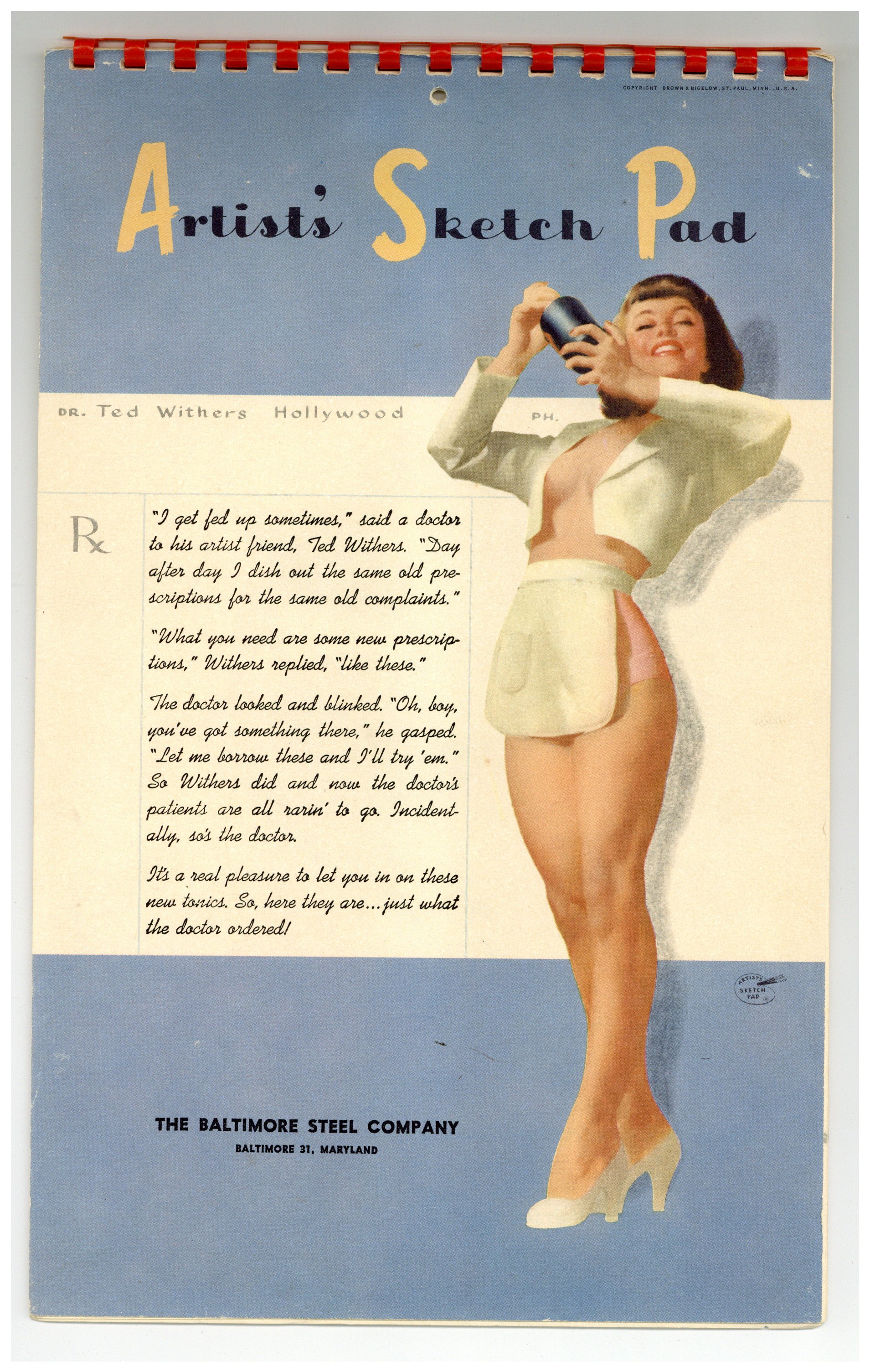 Published 1954 by Brown & Bigelow.$200.00Spiral-bound pin-up calendar by Ted Withers (1896-1964). Promotional item printed by Brown & Bigelow and distributed through various retail outlets.
