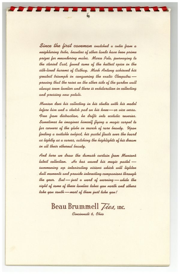 Published 1946 (est.) by Brown & Bigelow.$200.00Spiral-bound pin-up calendar by K.O. Munson (1900-1967). Promotional item printed by Brown & Bigelow and distributed through various retail outlets.