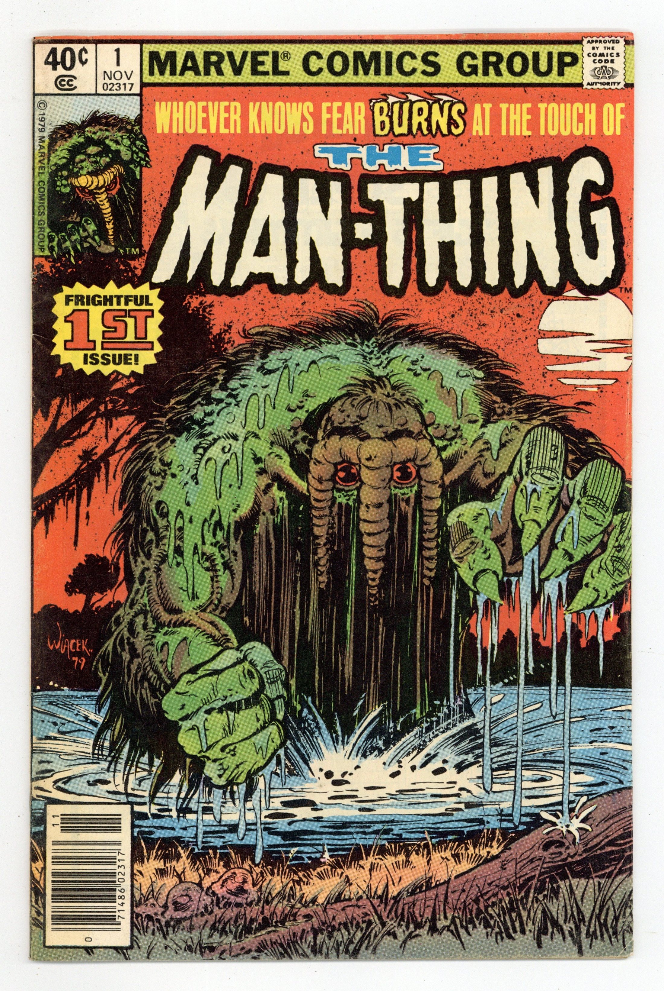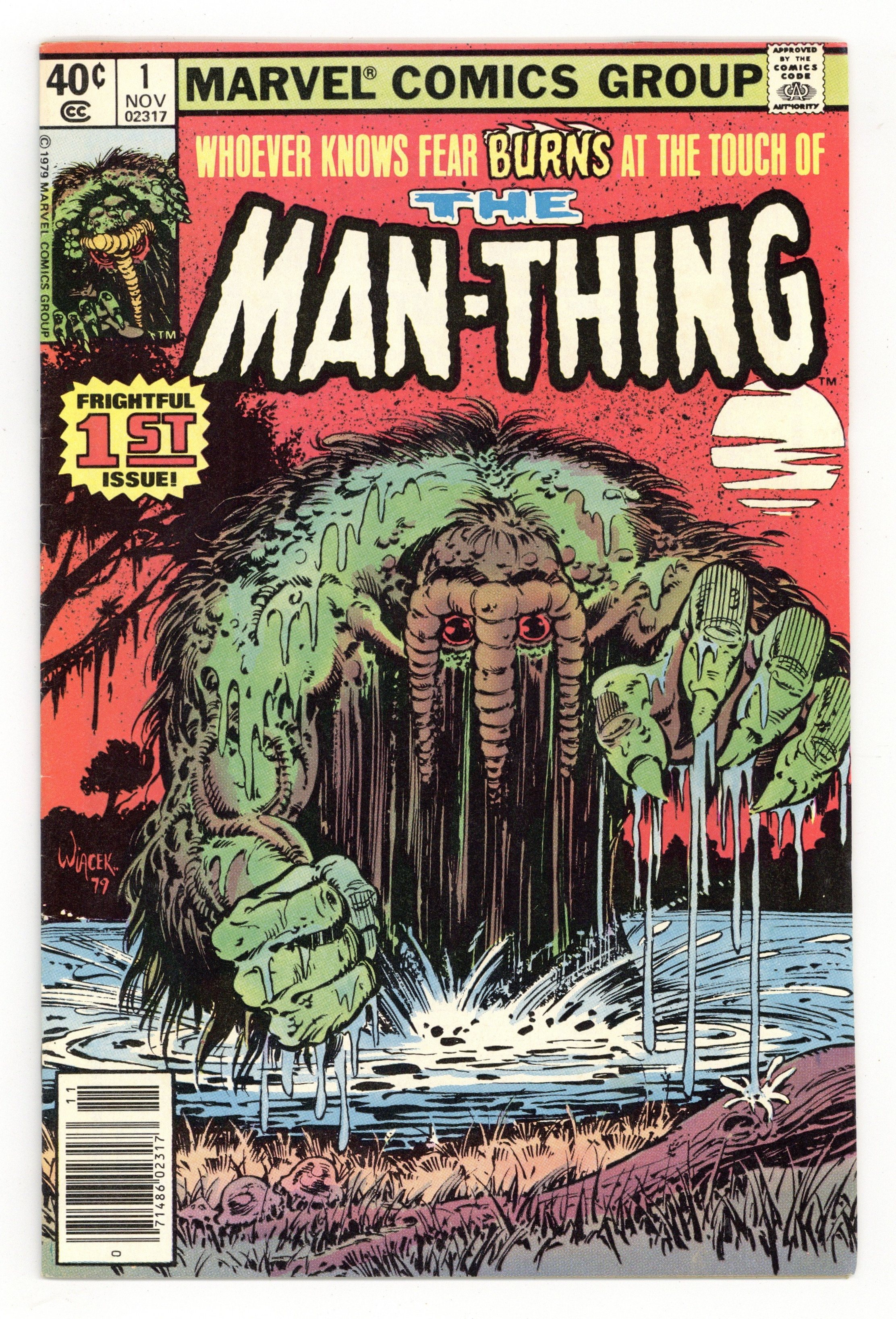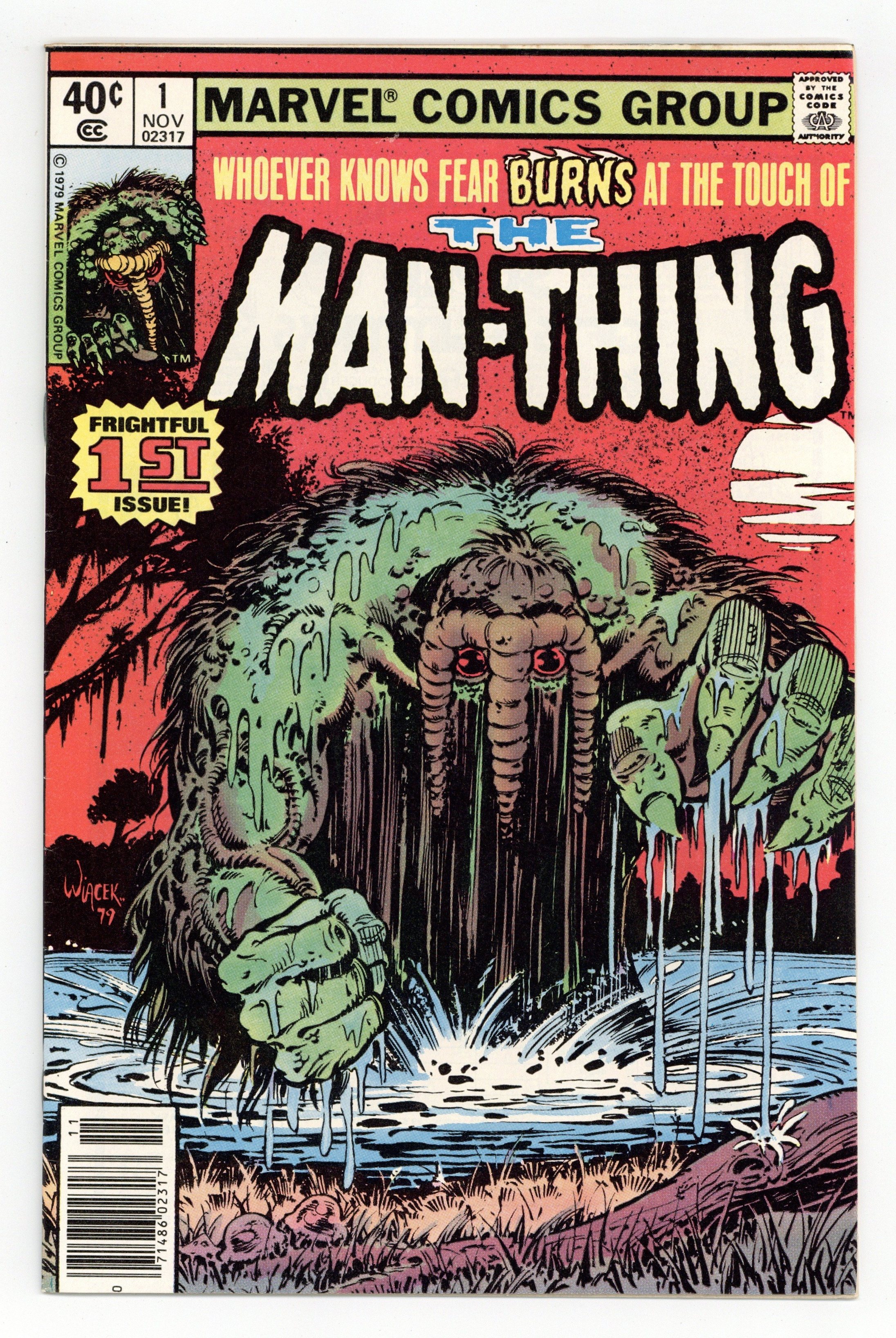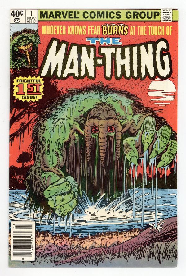 Newsstand Edition. "Regeneration and Rebirth!" Written by Michael Fleisher. Art by Jim Mooney and Bob Wiacek. Whoever knows fear BURNS at the touch of the Man-Thing. A group of scientist set out to cure the shambling mass of muck and flora the Man-Thing, a monstrous creature that was once known as Ted Sallis. But before they can treat the monster, they must capture it. A feat easier said than done. 32 pages, FC. Cover price $0.40.
