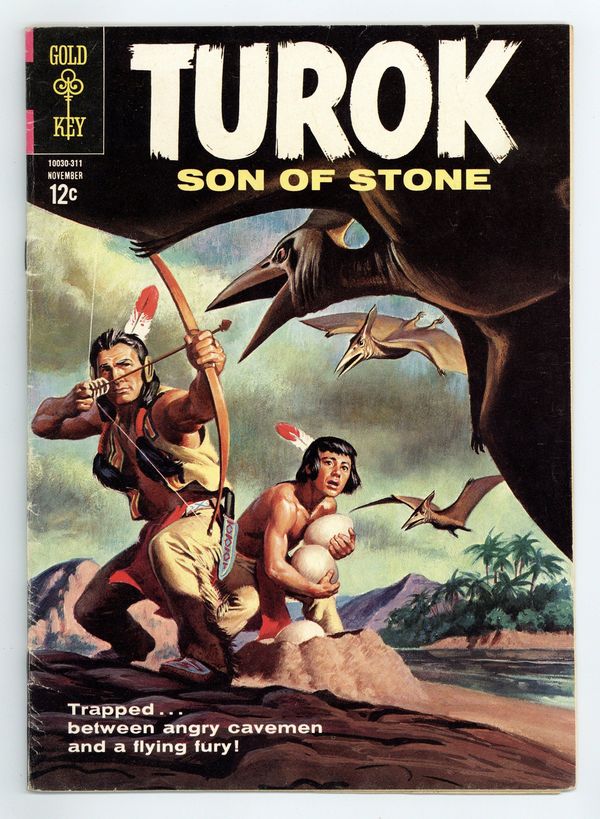 Published Nov 1963 by Dell/Gold Key.$20.50Painted cover. Turok in "The Angry Mountain" in which Turok and Andar help a tribe of cavemen threatened by a volcano and "The Flying Menace" in which Turok and Andar are trapped between dinosaurs and angry cavemen who believe the dinosaurs are gods. Both stories are reprints from previous issues. Issue also has backup feature "Young Earth - The Stag-Headed Man," a one-page text feature "Early Weapons: The Bone," and one-page strips. No art/story credits given. 36 pages, full color. Cover price $0.12.