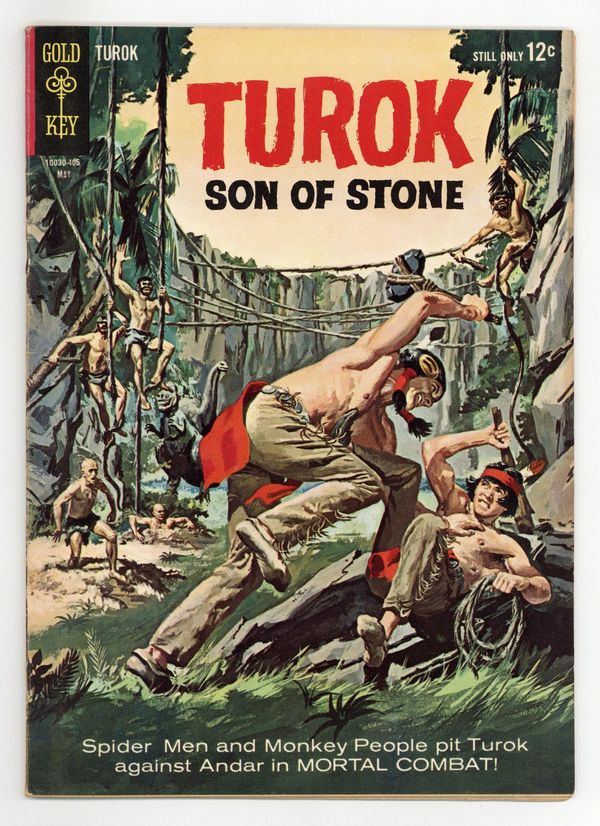 Painted cover. Turok in "Mortal Combat" in which Turok and Andar face warring tribes of "monkey men" and "spider-men." Issue also has backup feature "Young Earth - The Warrior," a one-page text feature "The Origin of Man - The Fire-Bringers," and one-page strips. No art/story credits given. 36 pages, full color. Cover price $0.12.