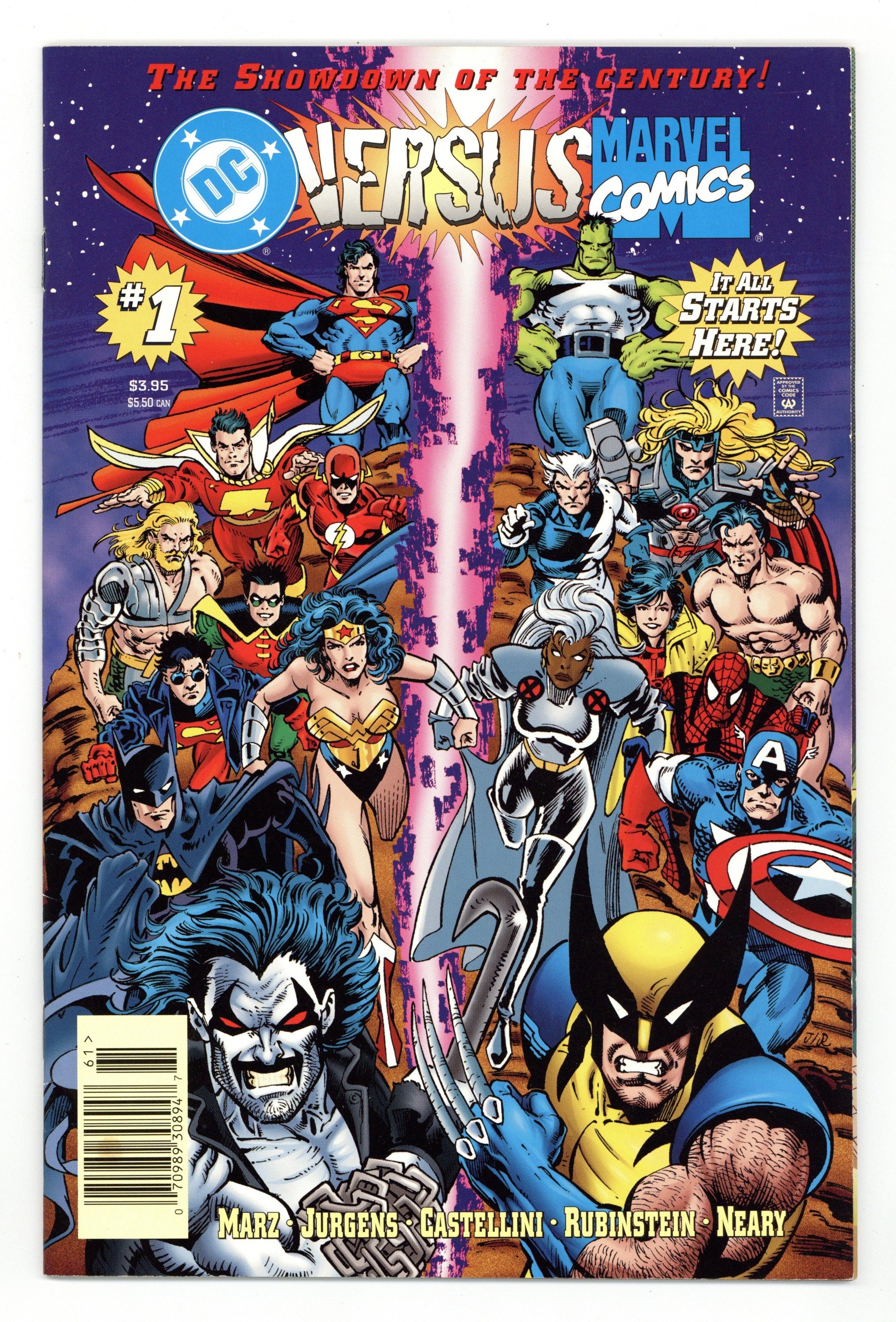 Tags: Hero/Villain Teams$15.501st printing. Newsstand Edition. "Round 1!" Part 1 of 4. Story by Ron Marz (with special thanks to Peter David). Art by Dan Jurgens, Claudio Castellini, Joe Rubenstein, and Paul Neary. When a young man stumbles upon a cosmic anomaly, the DC and Marvel Universes begin to merge with some most unexpected results. The Juggernaut is running amuck in Metropolis, the murderous Bullseye invades the Batcave, Robin the Boy Wonder pops up at Xavier's School for the Gifted, and J. Jonah Jameson is Editor-n-Chief of the Daily Planet. Then, things get worse when the very fabric of reality threatens to destroy itself. Now, the champions of two universes must combat each other for the fate of their own existence. Includes the back-up feature "Decision '96" with dossiers on Superman, Hulk, Captain America, Batman, Wonder Woman, Storm, Wolverine, Lobo, Superboy, and Spider-Man. Plus, the ballet for the readers to vote and decide the pivotal battles and thus the outcome of this epic event. Cover price $3.95.