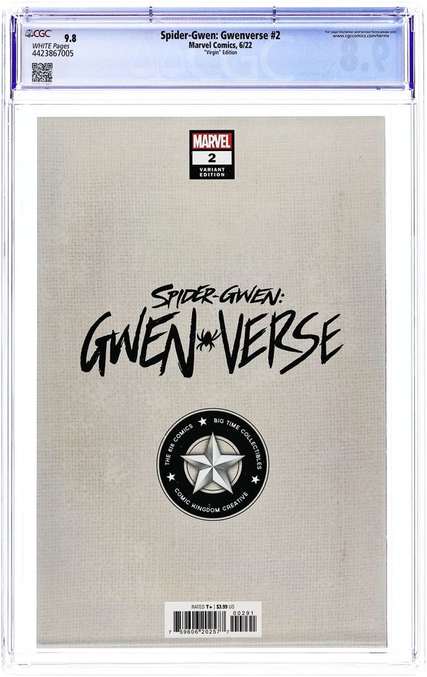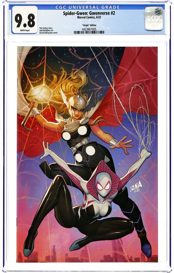 The 616 Comics, Big Time Collectibles, and Comic Kingdom Creative Exclusive Virgin Cover by David Nakayama. Written by Tim Seeley. Art by Jodi Nishijima. To stop another Gwen Stacy from corrupting the world, Ghost Spider must team up with Thorgwen and travel back in time! But will this new alliance be able to stand against the Super-Soldier might of Captain America Gwen? They will have to try as it looks like she's out for revenge against ANOTHER Gwen Stacy! 28 pages, full color. Rated T+