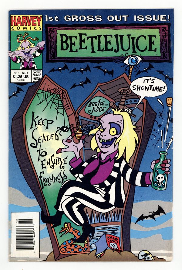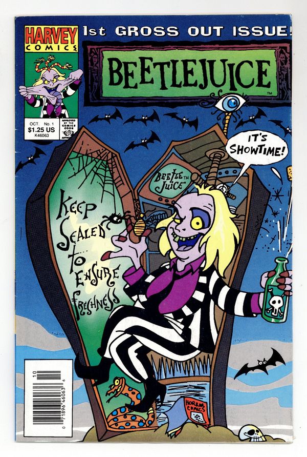 $20.50Newsstand Edition. Stories and art by Angelo De Cesare, Ernie Colon, Frank Hill, Jorge Pacheco and Dave Manak. A revived Harvey, longtime publisher of Casper the Friendly Ghost, presents the most un-Casper-like ghost imaginable. The comic is actually based on the short-lived TV cartoon, based in turn on Tim Burton's first hit movie. The series starts with a retrospective of Beetlejuice's life in the afterlife, followed by his first pin-up. This Is Your Lice; Beetlejuice's 1st Pin-Up ... A Pin-Down; Scuzz-O. 36 pages, full color. Cover price $1.25.
