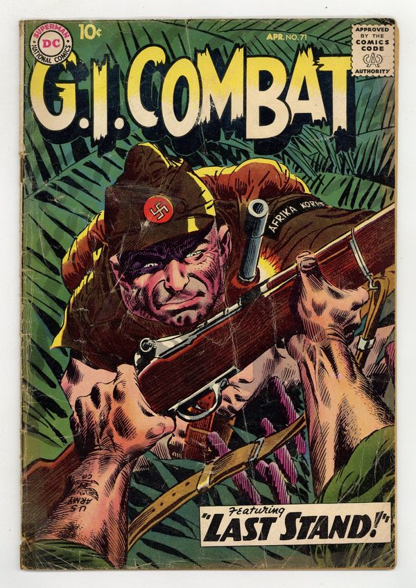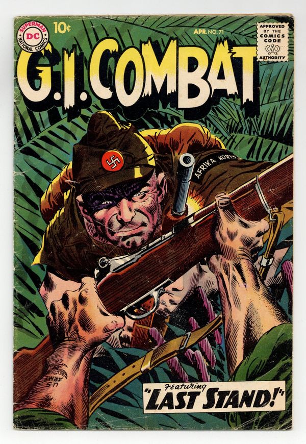 Cover by Joe Kubert. Written by Robert Kanigher and Bob Haney. Art by Ross Andru, Mort Drucker, Jack Abel and Mike Esposito. A group of soldiers are on the march to a 'last stand.' But as Patton might have said, it's not their job to make a last stand, it's their job to get the enemy to make its last stand in "Last Stand!" by Robert Kanigher, Ross Andru and Mike Esposito. Plus: An airman promises to bring the experience of the air war back to his brother on the ground in "Eyes for a Fort!" by Bob Haney and Mort Drucker. Also: A green recruit has to learn not to be separated from his squad in "Don't Come Back Alone" by Kanigher and Jack Abel. And: 1-pager "True to the End!" 36 Pages, Full Color. Cover price $0.10.