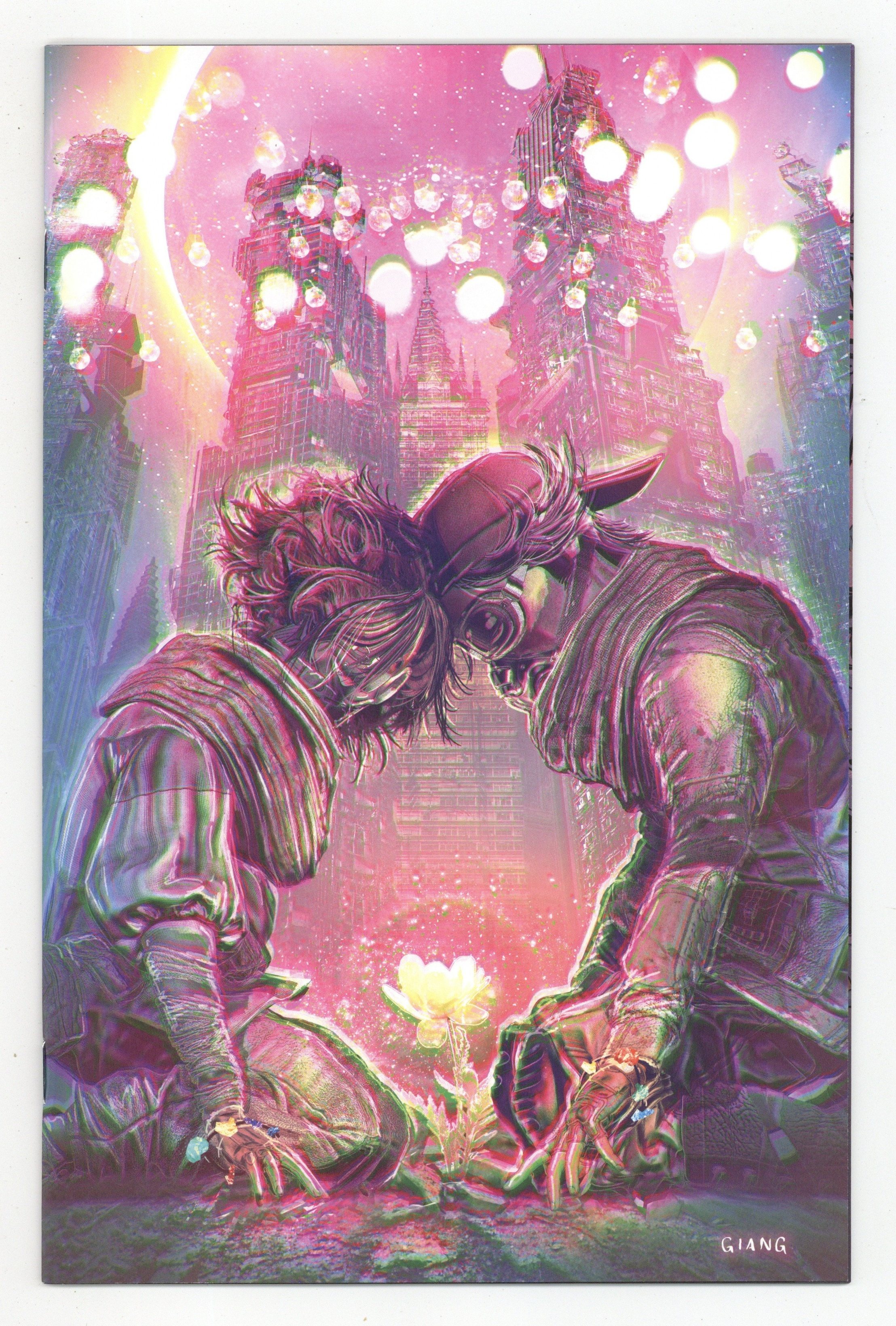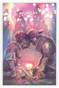 Published 2022 (est.) by Boom Studios.$12.00The 616 Comics Exclusive Virgin Cover by John Giang. Written by Jason Aaron. Art by Alexandre Tefenkgi. Love in the Wasteland' kicks off the first arc of this epic trilogy that spans a lifetime as the dark mysteries of a ruined world and their own stark differences tear at the threads holding Mezzy and Maceo together. As they endure the horrors of plastic tornadoes and frozen sludge, Maceo proves to be more than just a burden, and they make an unlikely connection. But to their peril... they might not be as alone as they thought... New York Times bestselling, Eisner and Harvey Award-winning writer Jason Aaron (Thor, The Avengers, Southern Bastards) launches his most ambitious original series to date with three distinct artistic partners - Eisner Award-winning artist Alexandre Tefenkgi (The Good Asian), acclaimed artists Leila del Duca (Wonder Woman: Tempest Tossed, Sleepless), and Nick Dragotta (East of West, Ghost Cage) - to take on a vision of the end of the world that's brutal and nostalgic, whimsical and grounded... and ultimately, timeless. Collects Once Upon A Time At The End Of The World #1-5. 32 pages, full color. Rated M