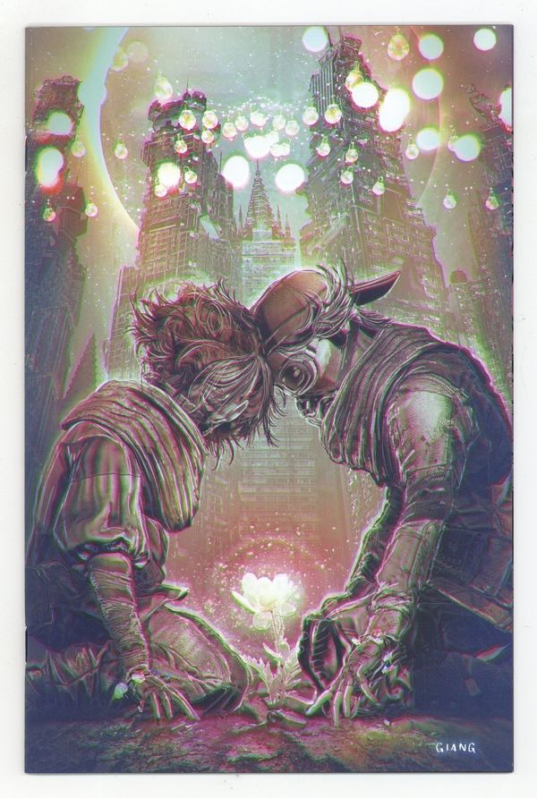 Published 2022 by Boom Studios.$9.00The 616 Comics Exclusive Virgin Cover by John Giang. Written by Jason Aaron. Art by Alexandre Tefenkgi. Love in the Wasteland' kicks off the first arc of this epic trilogy that spans a lifetime as the dark mysteries of a ruined world and their own stark differences tear at the threads holding Mezzy and Maceo together. As they endure the horrors of plastic tornadoes and frozen sludge, Maceo proves to be more than just a burden, and they make an unlikely connection. But to their peril... they might not be as alone as they thought... New York Times bestselling, Eisner and Harvey Award-winning writer Jason Aaron (Thor, The Avengers, Southern Bastards) launches his most ambitious original series to date with three distinct artistic partners - Eisner Award-winning artist Alexandre Tefenkgi (The Good Asian), acclaimed artists Leila del Duca (Wonder Woman: Tempest Tossed, Sleepless), and Nick Dragotta (East of West, Ghost Cage) - to take on a vision of the end of the world that's brutal and nostalgic, whimsical and grounded... and ultimately, timeless. Collects Once Upon A Time At The End Of The World #1-5. 32 pages, full color. Rated M