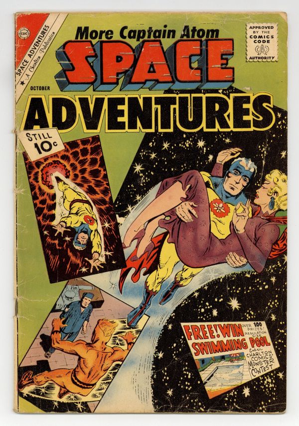 Published Oct 1961 by Charlton Comics Group.$26.00Cover by Steve Ditko. Stories and art by Steve Ditko, Bill Molno, Rocco "Rocke" Mastroserio, Joe Gill and Vince Alascia. Sci-fi and super-heroics from Charlton Comics. Captain Atom encounters The Silver Lady from Venus, a sort of space-siren who mesmerizes Earth's military forces, in a story with early art by Spider-Man co-creator Steve Ditko. In another story, Captain Atom learns the truth about UFOs when he meets them in combat. These stories are accompanied by a non-fiction piece about the state of rocket science in 1961. Captain Atom: The Saucer Scare; They Said He Would Die; The Rocket Comes of Age; Captain Atom: The Man in Saturn's Moon; The Other Side of the Mirror; Captain Atom: The Silver Lady from Venus. 32 pages, Full Color. Cover price $0.10.