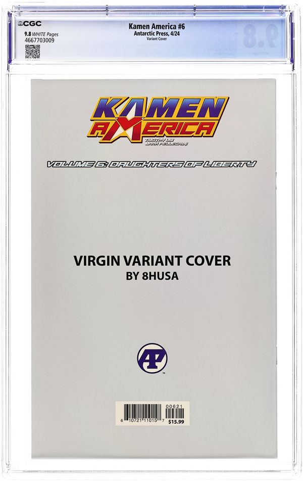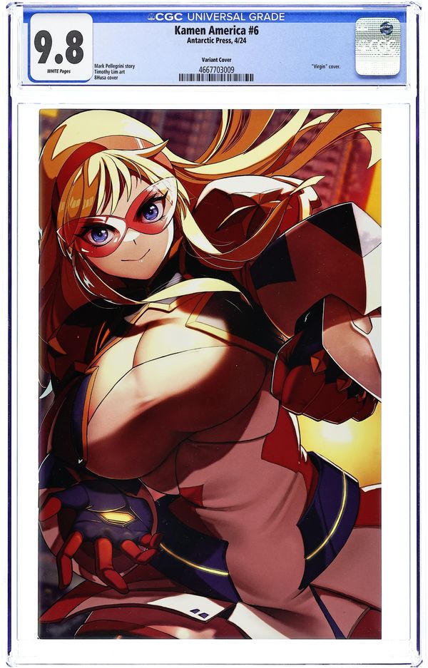 Written by Mark Pellegrini. Art by Timothy Lim. Cover by 8HUSA. AMERICAN HENSHIN HEROINE! DIVERSE MASKED WARRIORS FIGHTING FOR A 'KAMEN' CAUSE! The sixth volume of the Kamen America series continues the saga of Carly Vanders and her friends as they clash with evildoers and evil robots! Along the way, the Kamen Corps' rivalry with the henshin-hero team known as the Zenerengers heats up as their boss takes the stage: Kamen Unity! Who is this mystery woman and what is her connection to Kamen Victory? Find out in this exciting and emotional new chapter! Victory can be yours-literally! Just get yourself a copy of this variant edition with a sure-win virgin cover featuring Kamen Corps member Kamen Victory, drawn by 8HUSA ('Hachi-fusa')! 56 pages, full color. Cover price $15.99.