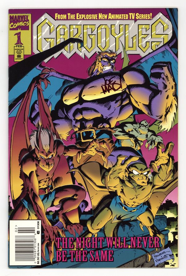 Newsstand Edition. Cardstock Embossed Cover. Written by Martin Pasko. Art by Amanda Conner and Alberto Saichann. Cover by Joe Madureira and Jimmy Palmiotti. Fiends In High Places; David Xanatos is up to his same tricks as and Demona try to capture the Gargoyles; They do this by setting up the Gargoyles and making them look bad; It is up to Eliza Maza to protect the Gargoyles' reputation but things are made more difficult for her when Goliath won't stay out of it and she has to hide things from her new partner Matt Bluestone. Written In Stone introduction to the characters and creative team, written by Hildy Mesnik, art by Amanda Conner and Alberto Saichann. 36 pages, full color. $2.50. Cover price $2.50.