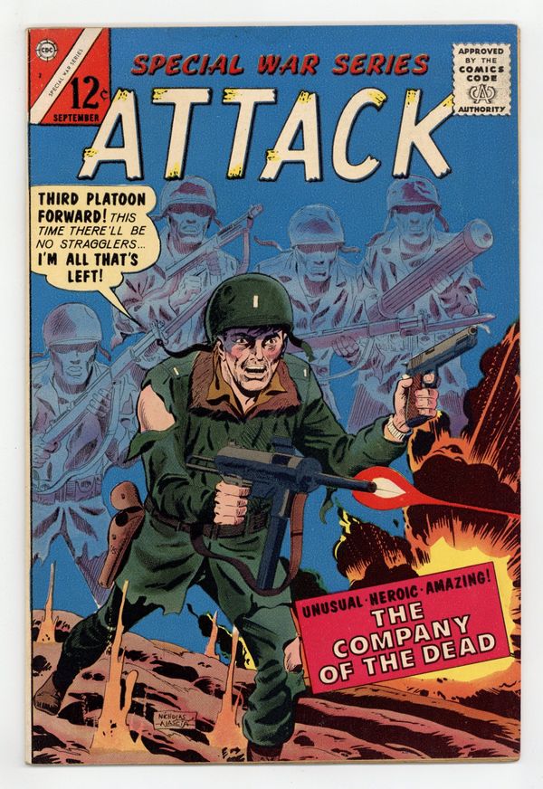 Cover by Charles Nicholas and Vince Alascia. Stories and art by Charles Nicholas and Vince Alascia. Allied soldiers face Axis forces during World War II. A broken tread leaves a tank company stranded behind enemy lines in Korea, so a repair team parachutes in. Pfc Reeder doesn't want to kill anyone, but then he finds himself in a French farmhouse with two Nazis and a captured Resistance fighter. The lone survivor of an Army squad is aided by the spirits of his dead buddies in finishing their assignment. A Long Way Home; Second Attempt; Non-Combatant with a Gun; Company of the Dead. Series continues as Attack (1966 4th Series Charlton) #3, while also somehow continuing with issue #3 of Special War Series. 32 pages, Full Color. Cover price $0.12.