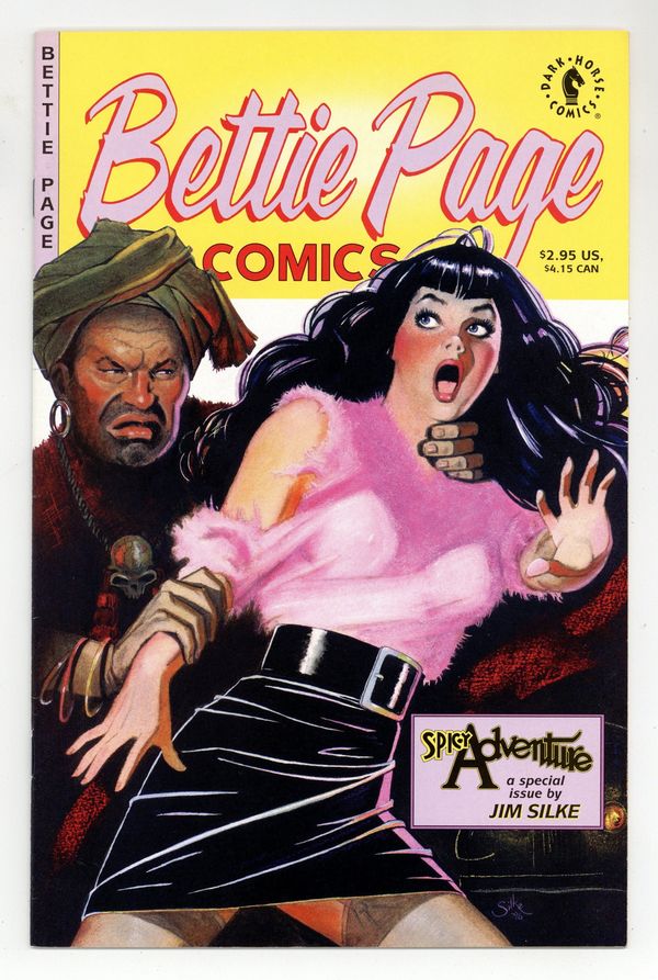 Published Jan 1997 by Dark Horse.$9.50Story and art by Jim Silke. It's New York, 1951. Midnight. Malay pirates abduct a high-heeled, molten mama and transport her to the 25th century, where she lands on a jungle-infested planet. There, everybody wants to enslave her. It's more than any normal girl could take, but she's Bettie Page, and with a wink, the snap of her hips, a handgun, several changes of costume, and no clothes at all, she fights back. FC. Cover price $2.95.