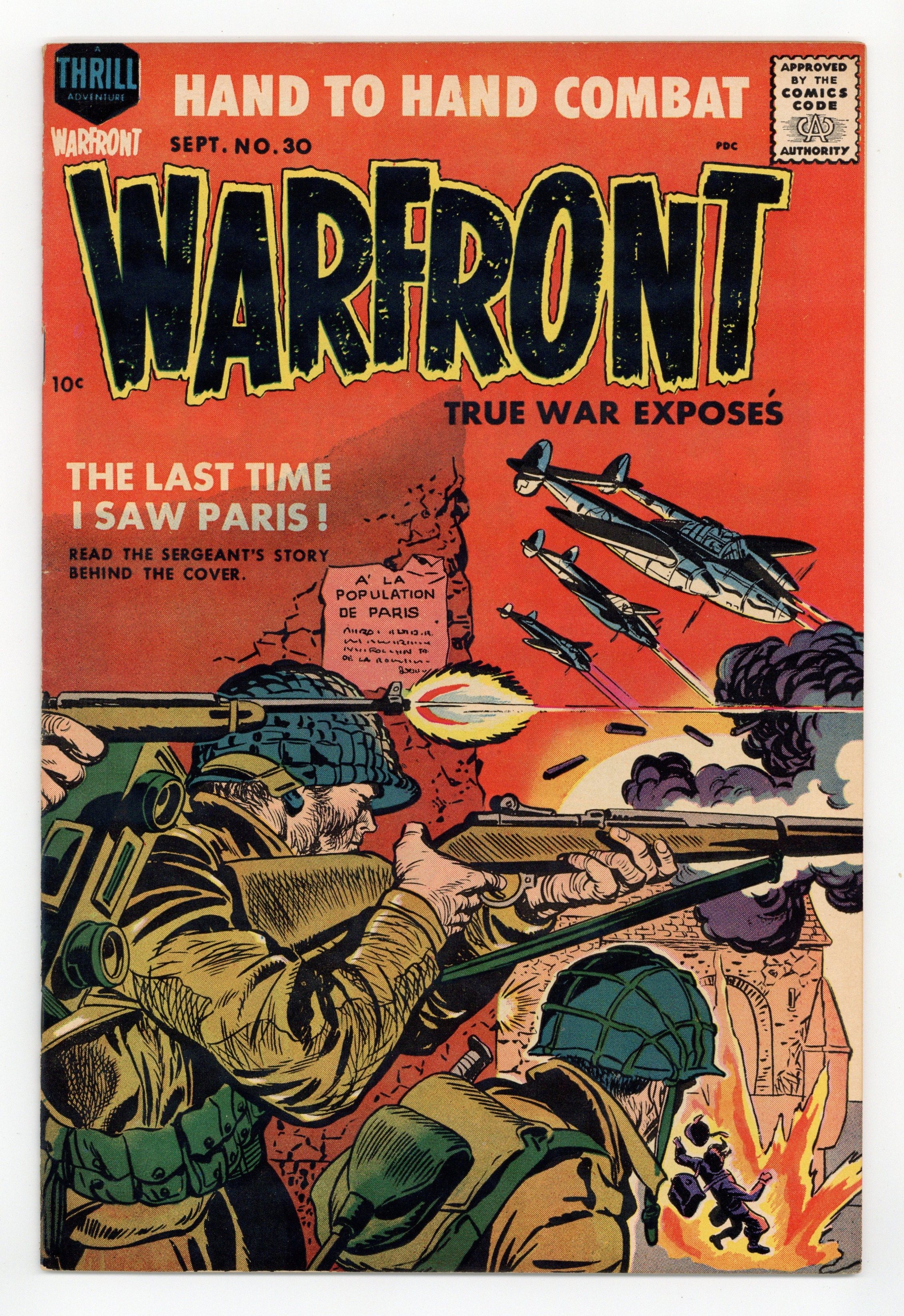 $75.00Stories and art by Bob Powell and Lee Elias. Tales of war from Harvey, published as the Cold War was heating up. A US soldier captured by the enemy has one chance: Mitzi, the squad mascot. After their bomber crash-lands, a tail-gunner stays in his seat to save his buddies. A reporter traveling with the troops witnesses a battle. Cover may be the work of comics legend Jack Kirby (and possibly Joe Simon). Medal for Mitzi; Guns, Gumption and Glory!; Somewhere In Korea!; Man To Man! 36 pages, full color. Cover price $0.10.