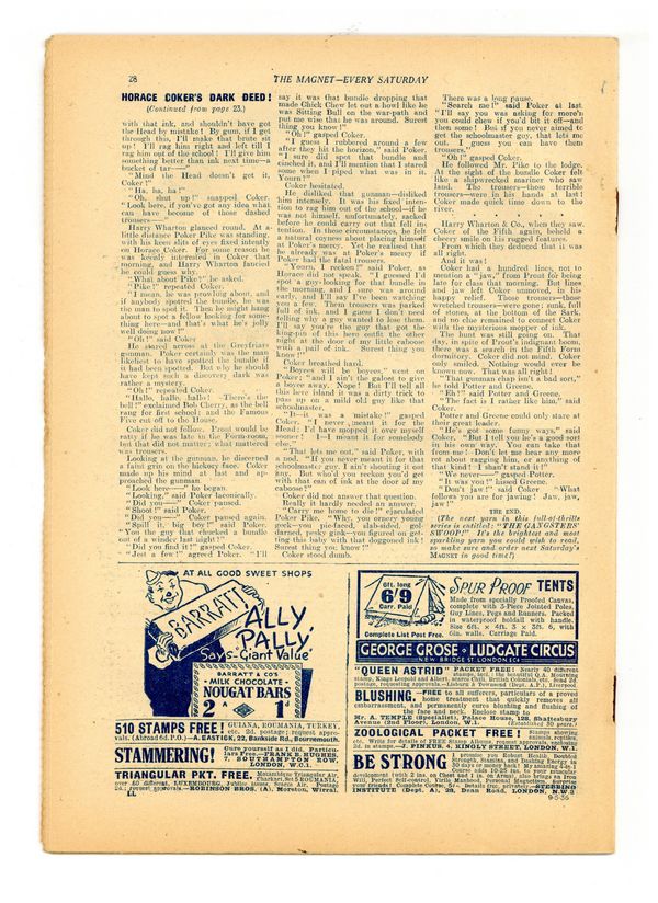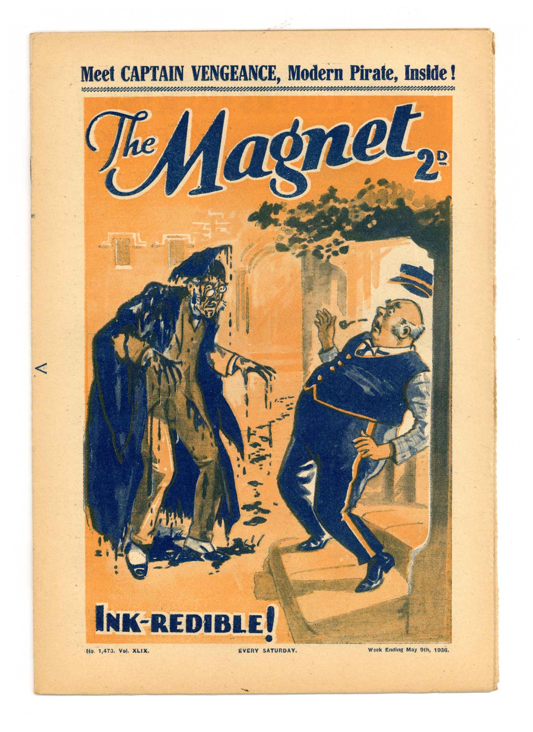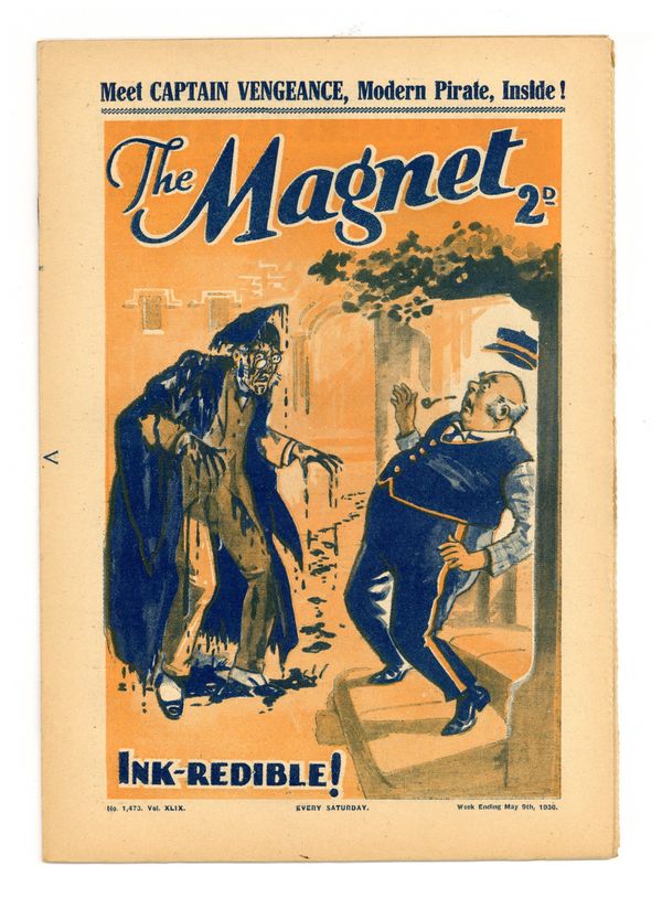 No. 1473 - May 09, 1936. Weekly British publication that ran for nearly 1,700 issues. Featured the anti-hero Billy Bunter of the Greyfriars School, along with serialized shorts. NOTE: This publication contains negative racial and cultural depictions. It reflects some attitudes of the era in which it was published that would not be acceptable today. 7.5" x 11", 28 pages, B&W.