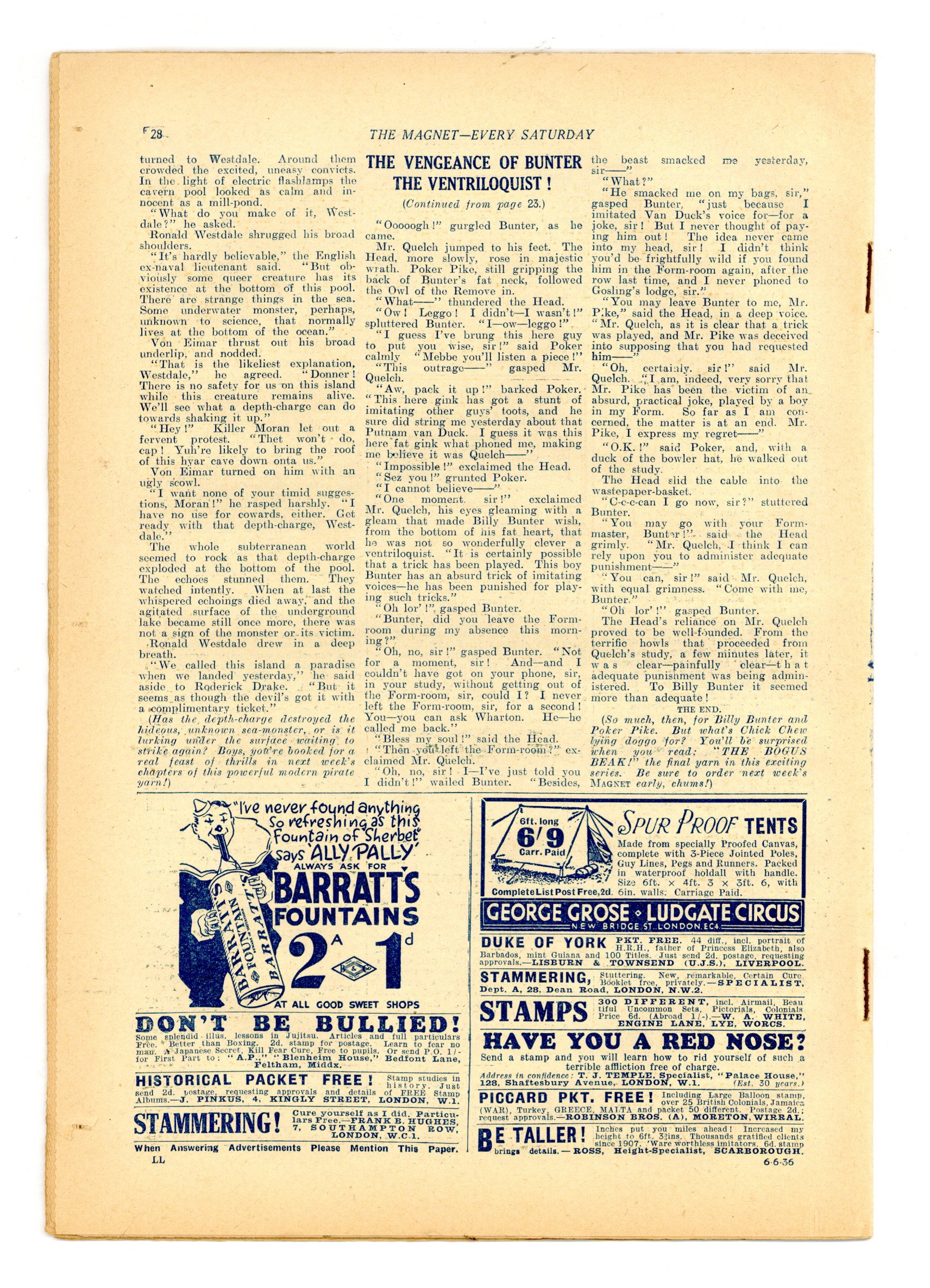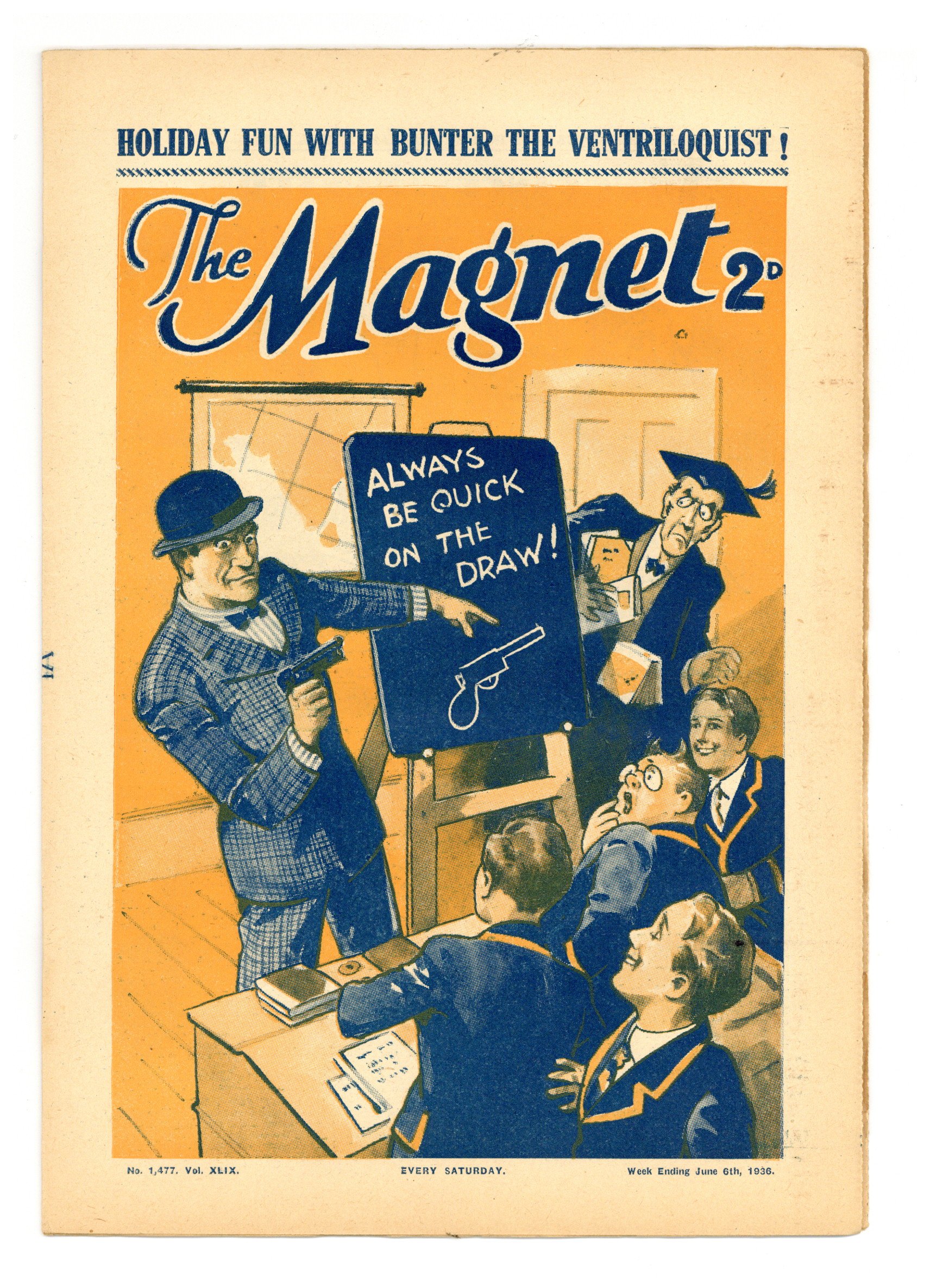No. 1477 - June 06, 1936. Weekly British publication that ran for nearly 1,700 issues. Featured the anti-hero Billy Bunter of the Greyfriars School, along with serialized shorts. NOTE: This publication contains negative racial and cultural depictions. It reflects some attitudes of the era in which it was published that would not be acceptable today. 7.5" x 11", 28 pages, B&W.