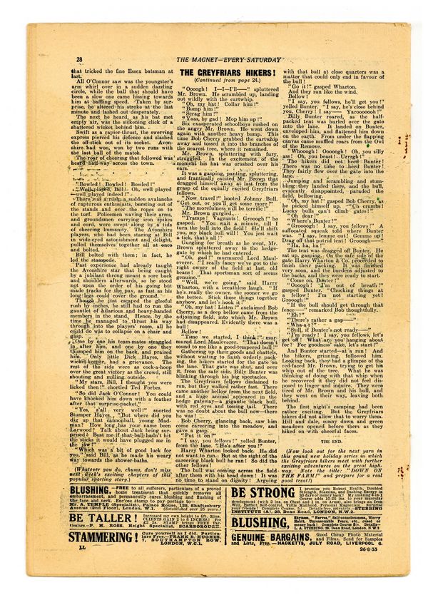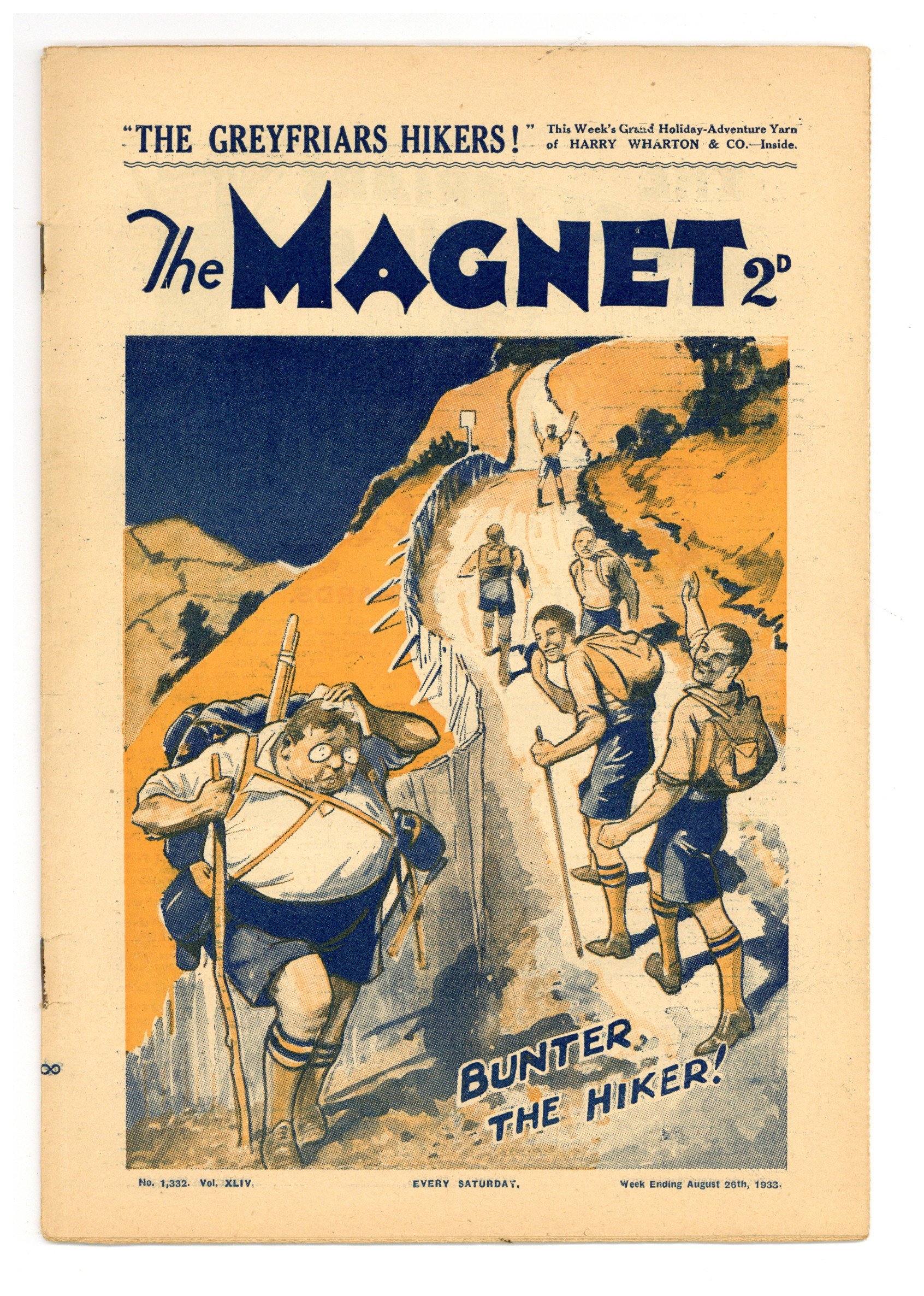 No. 1332 - August 26, 1933. Weekly British publication that ran for nearly 1,700 issues. Featured the anti-hero Billy Bunter of the Greyfriars School, along with serialized shorts.NOTE: This publication contains negative racial and cultural depictions. It reflects some attitudes of the era in which it was published that would not be acceptable today. 7.5" x 11", 28 pages, B&W.