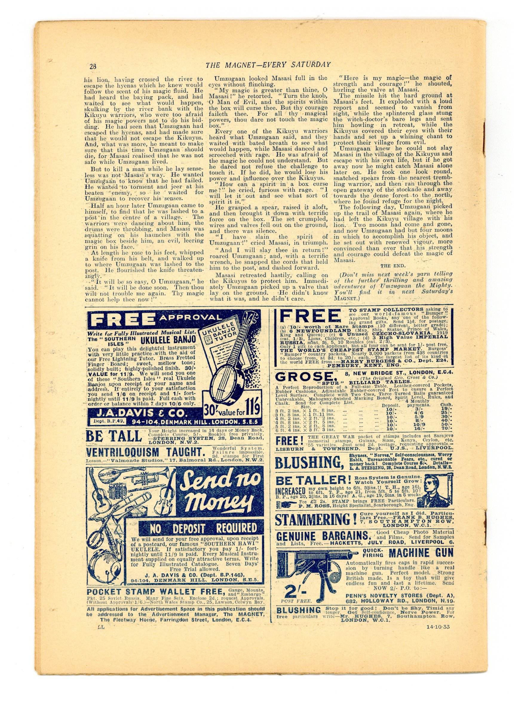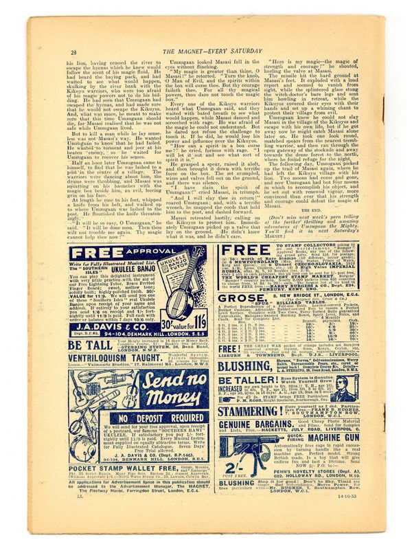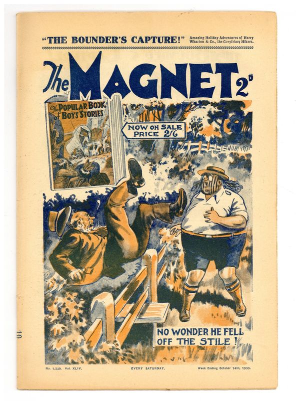No. 1339 - October 14, 1933. Weekly British publication that ran for nearly 1,700 issues. Featured the anti-hero Billy Bunter of the Greyfriars School, along with serialized shorts. NOTE: This publication contains negative racial and cultural depictions. It reflects some attitudes of the era in which it was published that would not be acceptable today. 7.5" x 11", 28 pages, B&W.