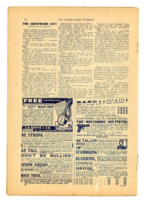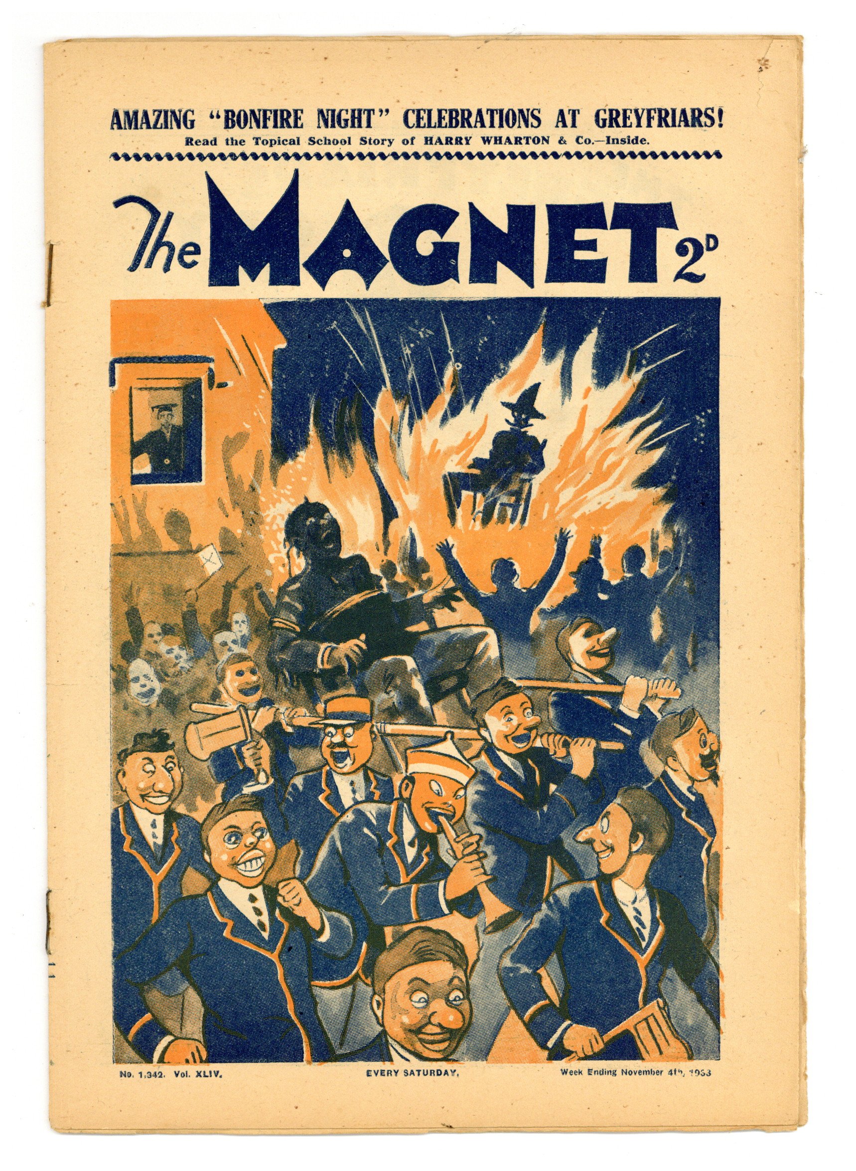 No. 1342 - November 04, 1933. Weekly British publication that ran for nearly 1,700 issues. Featured the anti-hero Billy Bunter of the Greyfriars School, along with serialized shorts. NOTE: This publication contains negative racial and cultural depictions. It reflects some attitudes of the era in which it was published that would not be acceptable today. 7.5" x 11", 28 pages, B&W.