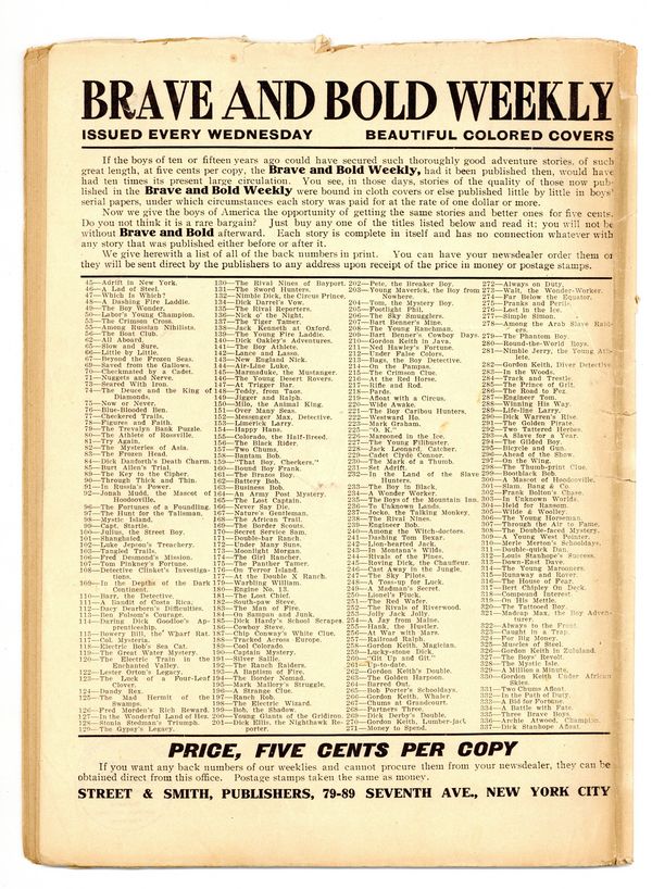 Published May 1909 by Street & Smith.$100.00- Spine split 10%. Staple rust: Slight.