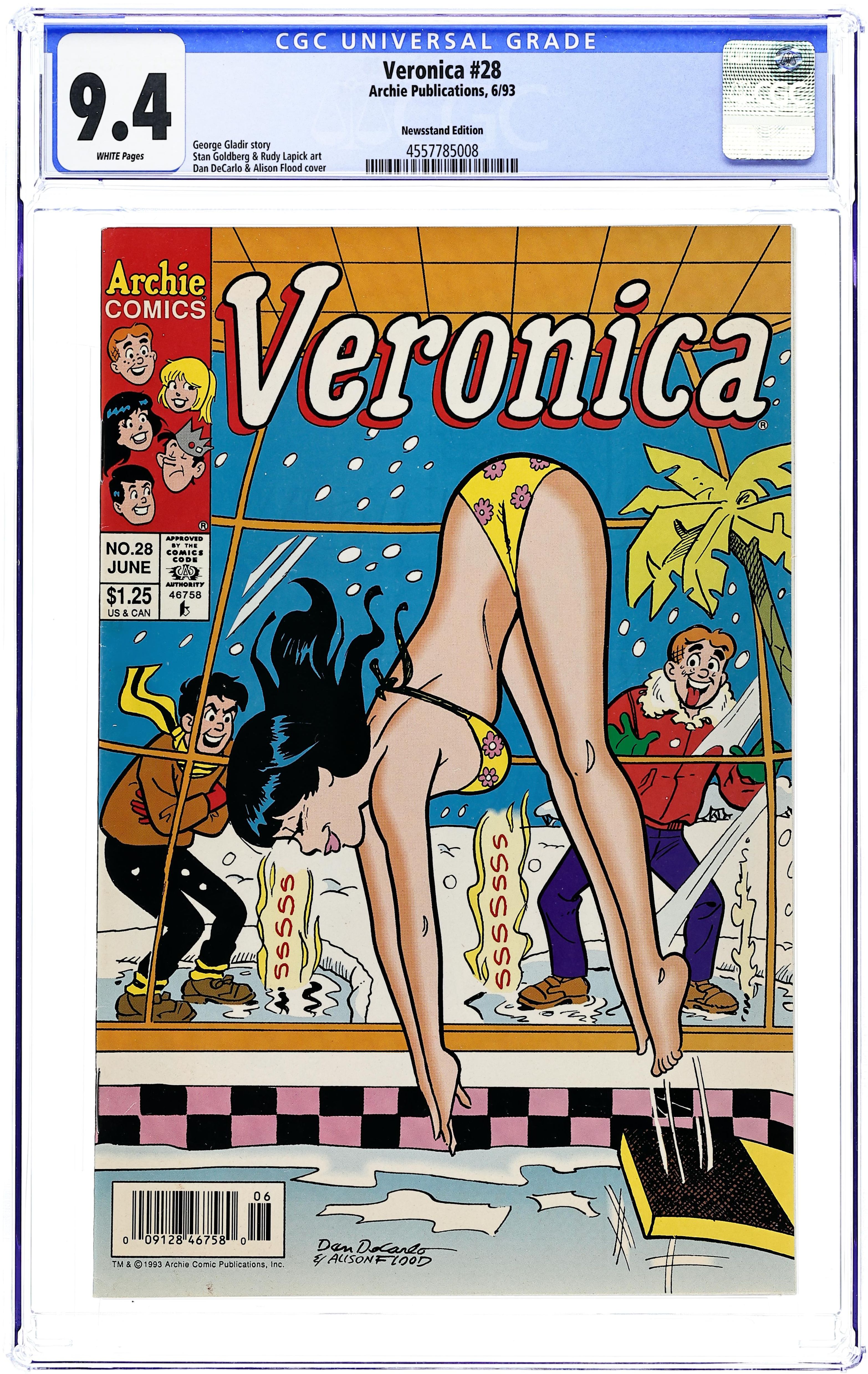 Newsstand Edition. Cover pencils by Dan DeCarlo, inks by Alison Flood. Archie and the Gang Tell about Recycling Pet Plastic Containers public service announcement. "The Genie Is a Teen-ie," script by Angelo Decesare, pencils by Stan Goldberg, inks by Rudy Lapick; Veronica dreams she's an Arabian princess. "Jest Request"; Mr. Lodge wants Veronica to get Jughead and Archie to stay out of the Lodge's refrigerator. Statement of Ownership; Average no. copies each issue during preceding 12 months. 134246; Actual no. of copies of single issue published nearest to filing date. 132165. Top 10 Reasons to Subscribe to an Archie Comic house ad. "Looking for Love," script by Angelo Decesare, pencils by Stan Goldberg, inks by Henry Scarpelli; While on a beach in Brazil, Veronica tries using a metal detector to help her meet a cute boy. "Mall in the Family," script by George Gladir, pencils by Stan Goldberg, inks by Rudy Lapick; Veronica competes in a mall shopping contest against her rival. Archie Americana Series house ad. 36 pgs., full color. Cover price $1.25.