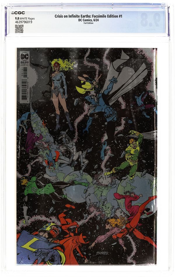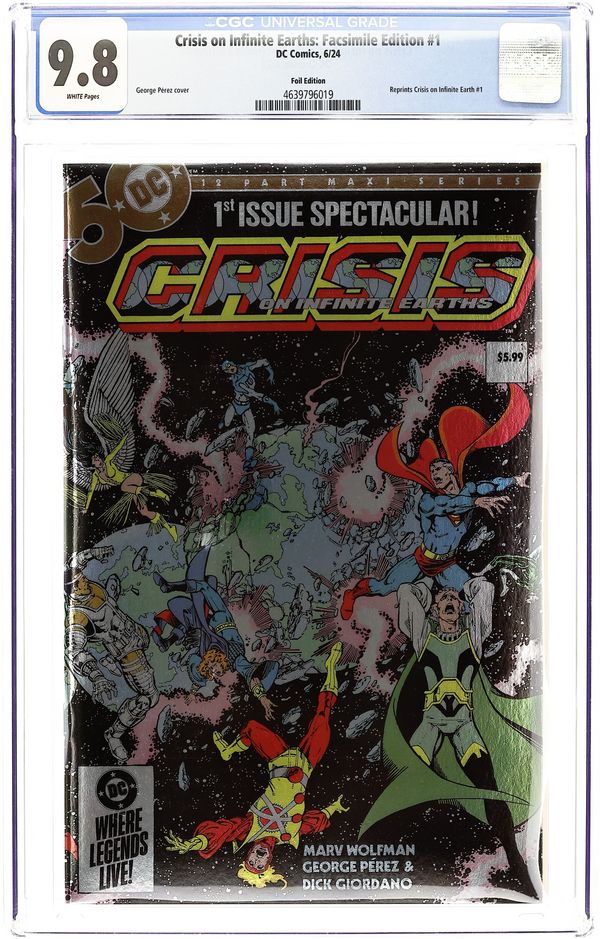 Foil Cover. Written by Marv Wolfman, Len Wein and Robert Greenberger. Art by George Perez and Dick Giordano. Cover by George Perez. THE TRANSFORMATIVE DC CROSSOVER RETURNS IN MONTHLY FACSIMILES OF ALL 12 ISSUES! Heroes will live! Heroes will die! And the DC Universe will never again be the same! The premiere issue of the landmark series that forever transformed the DC Universe and the superhero landscape is faithfully reprinted in a vibrant full-facsimile edition. 32 pages, full color. Rated T+ Cover price $5.99.