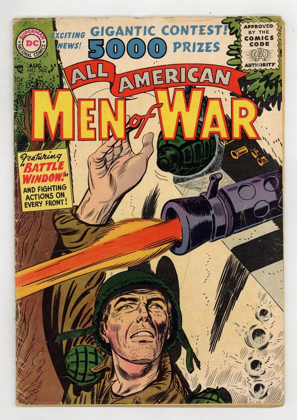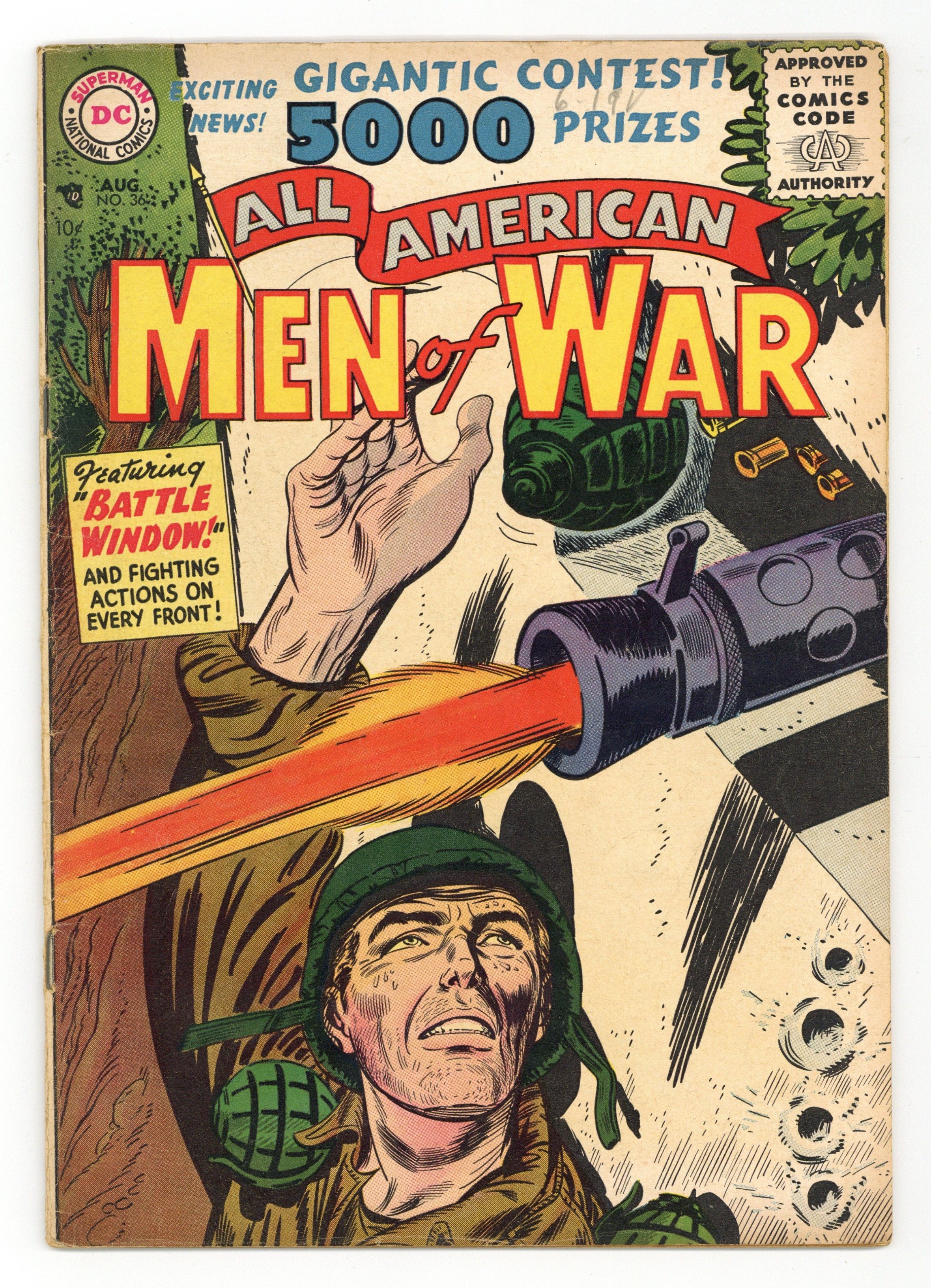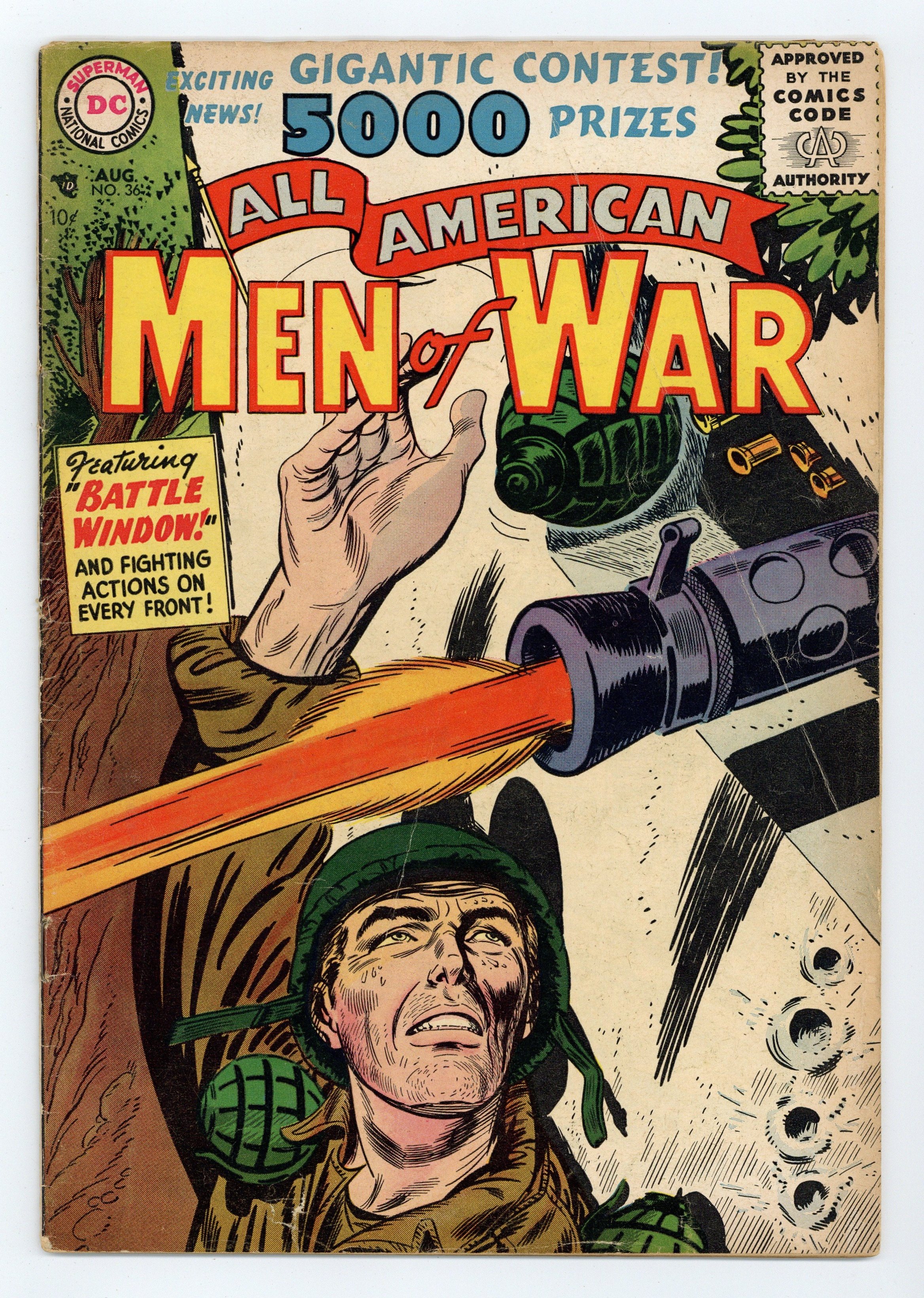 Little Sure Shot Prototype. Edited by Whitney Ellsworth. Cover by Jerry Grandenetti. Stories by Robert Kanigher, Ross Andru, Mike Esposito, Dave Wood, Bob Forgione, Jack Abel, Bob Haney, Joe Kubert, and Bill Finger. Adventure tales of war and the military, including some humor—go into combat with All American Men of War! 36 Pages, Full Color. Cover price $0.10.
