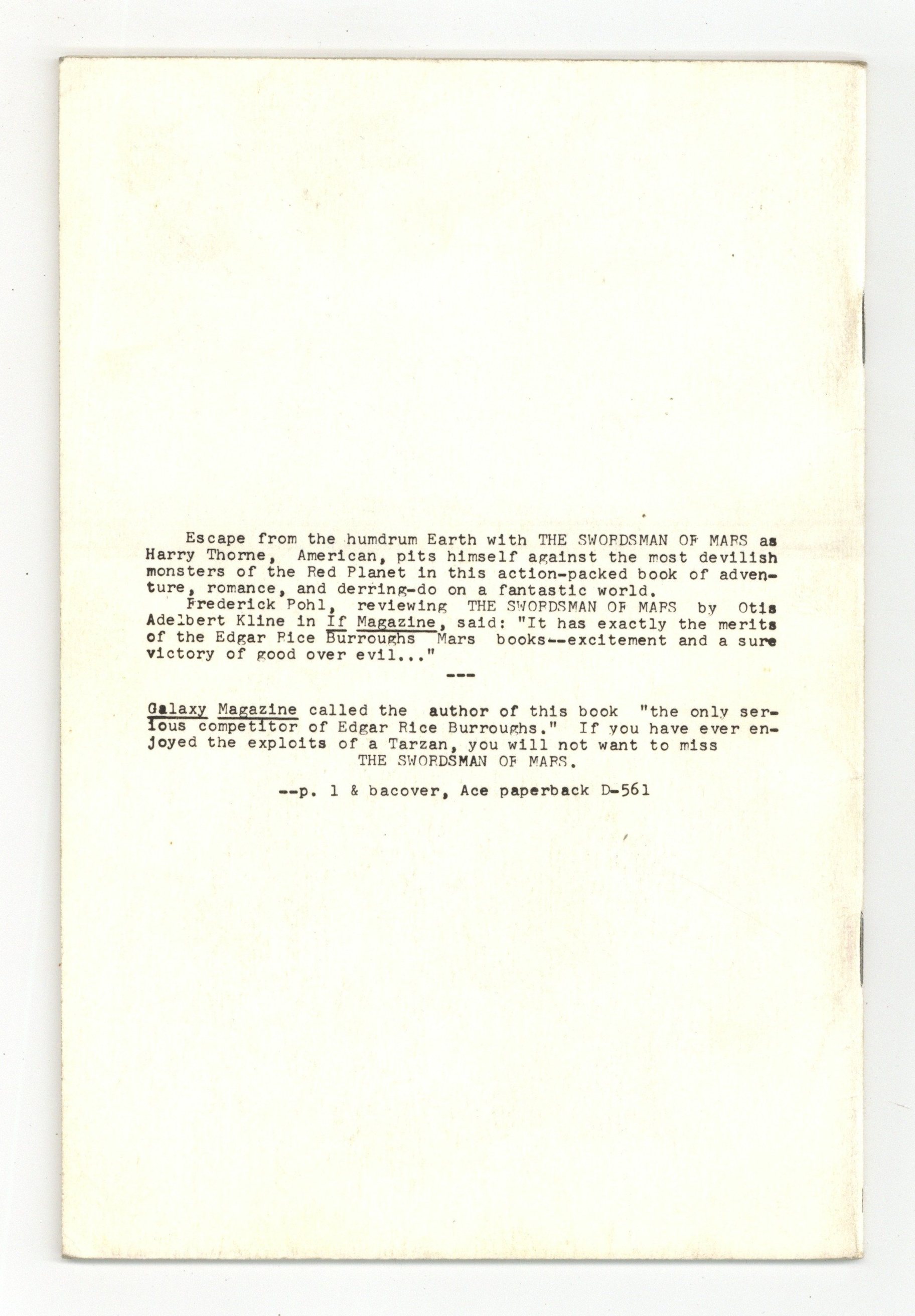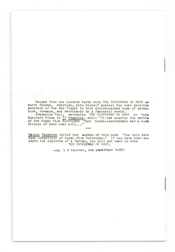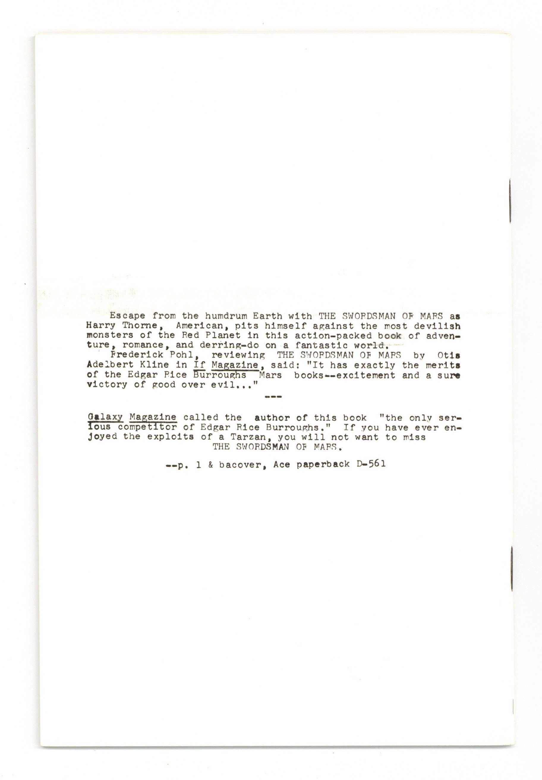 Fanzine devoted to O.A.K. (Otis Adelbert Klein). 5.5" x 8", 28 pages, B&W. Cover price $0.25.