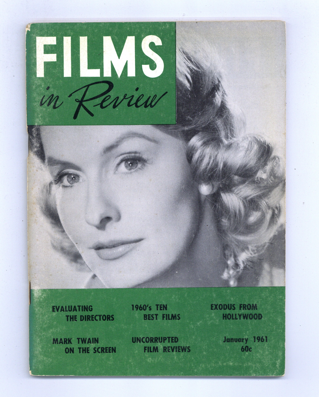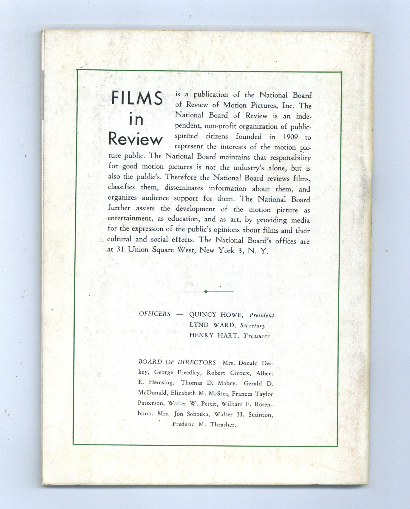 Film in Review is a publication of the National Board of Review of Motion Pictures, Inc, an independent, non-profit organization of public citizens founded in 1909 to represent the interests of the motion picture public. This National Board further assists the development of the motion picture as a source of entertainment, as education, and as art, by providing media for the expression of the public's opinion about films and their cultural and social effects. 5 1/2-in. x 7 1/2-in., 68 pages, B&W. Cover price $0.60.