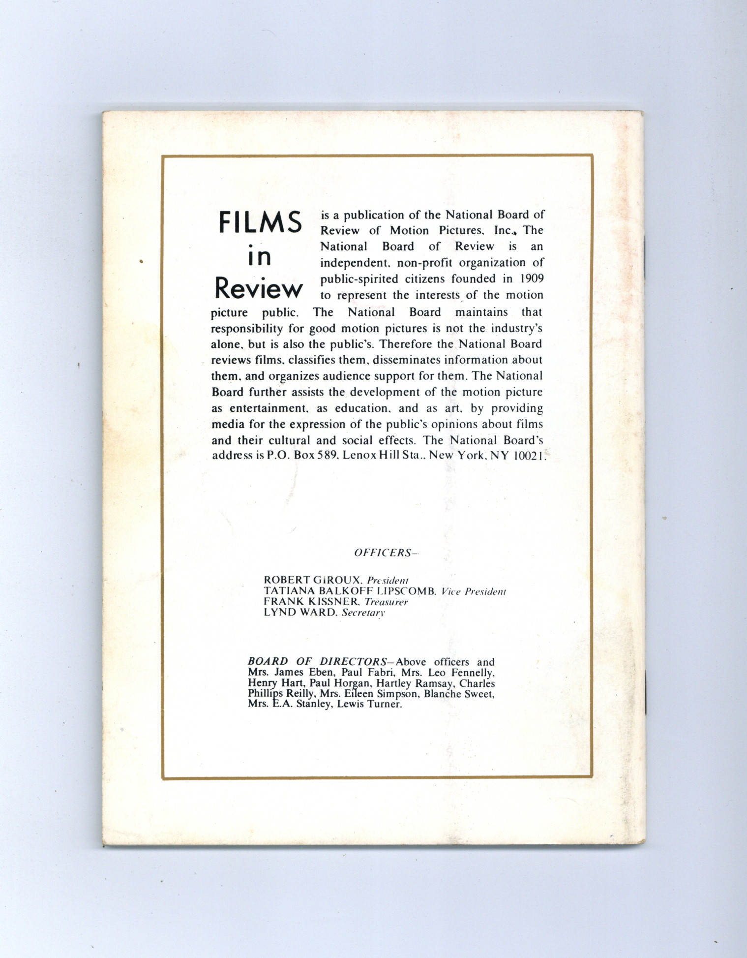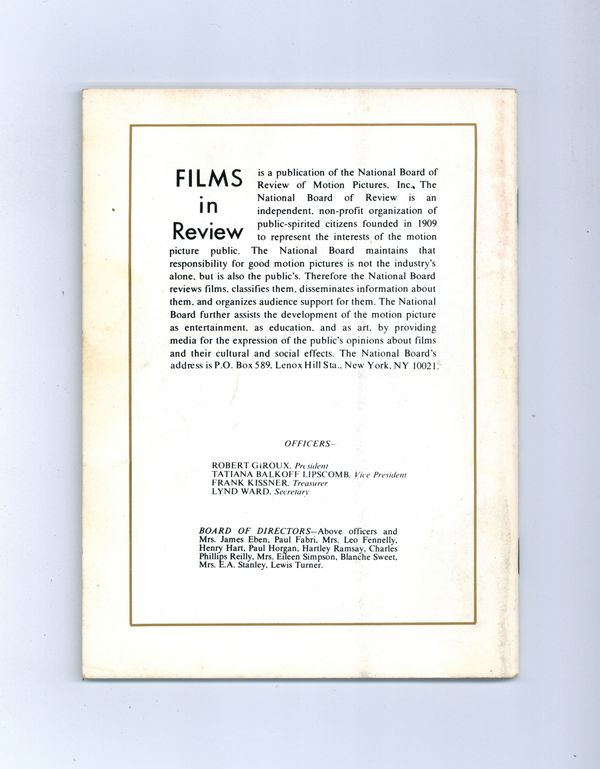 Published Jan 1979 by National Board of Review of Motion Pictures Inc..$4.00Film in Review is a publication of the National Board of Review of Motion Pictures, Inc, an independent, non-profit organization of public citizens founded in 1909 to represent the interests of the motion picture public. This National Board further assists the development of the motion picture as a source of entertainment, as education, and as art, by providing media for the expression of the public's opinion about films and their cultural and social effects. 5 1/2-in. x 7 1/2-in. Cover price $1.75.