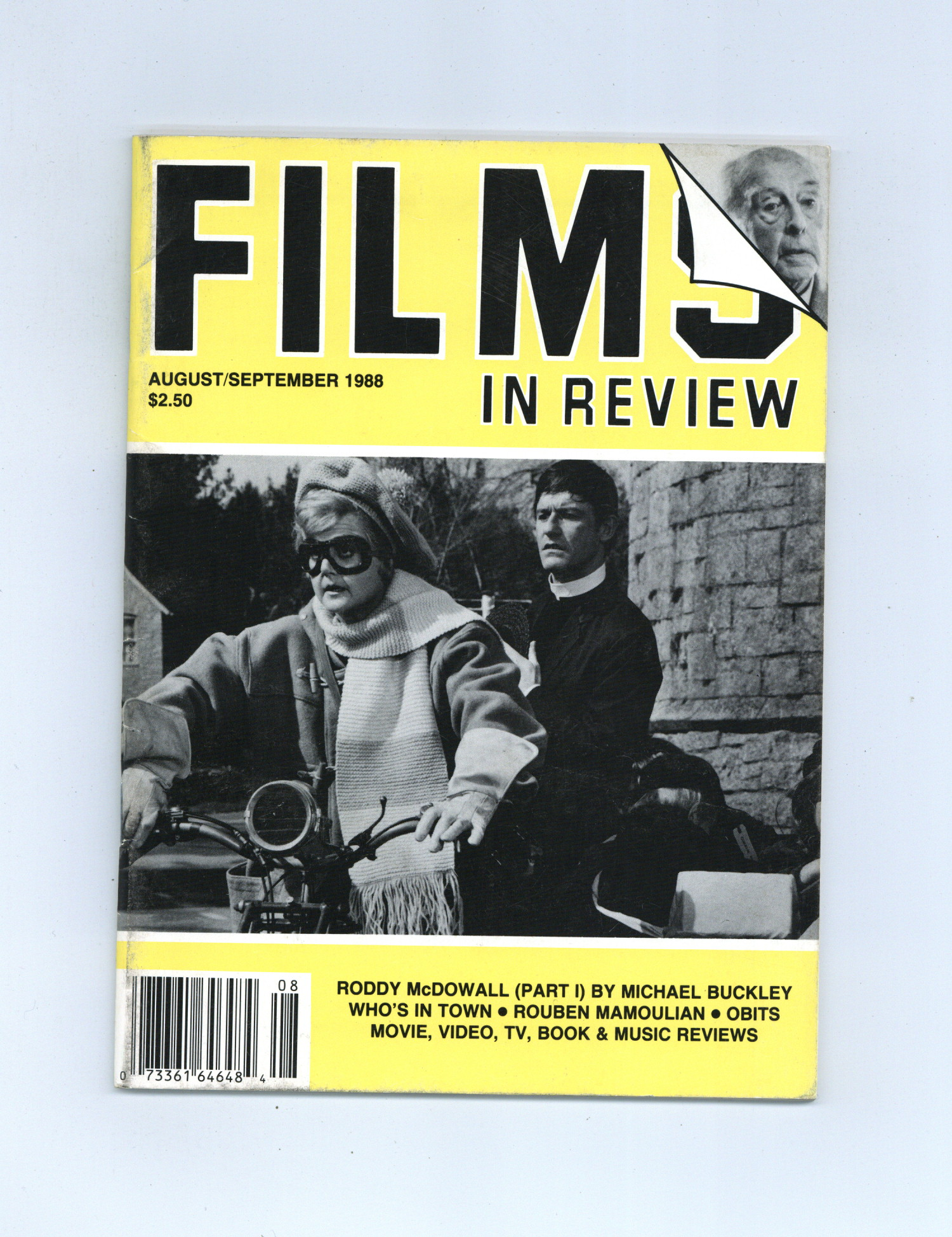 Published Aug 1988 by National Board of Review of Motion Pictures Inc..$16.00Film in Review is a publication of the National Board of Review of Motion Pictures, Inc, an independent, non-profit organization of public citizens founded in 1909 to represent the interests of the motion picture public. This National Board further assists the development of the motion picture as a source of entertainment, as education, and as art, by providing media for the expression of the public's opinion about films and their cultural and social effects. 5 1/2-in. x 7 1/2-in., 68 pages, B&W. Cover price $2.50.