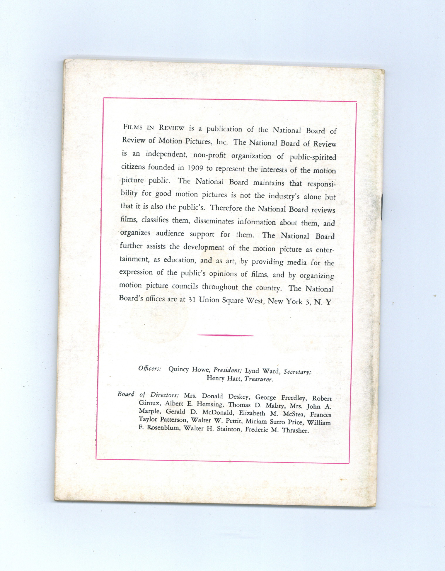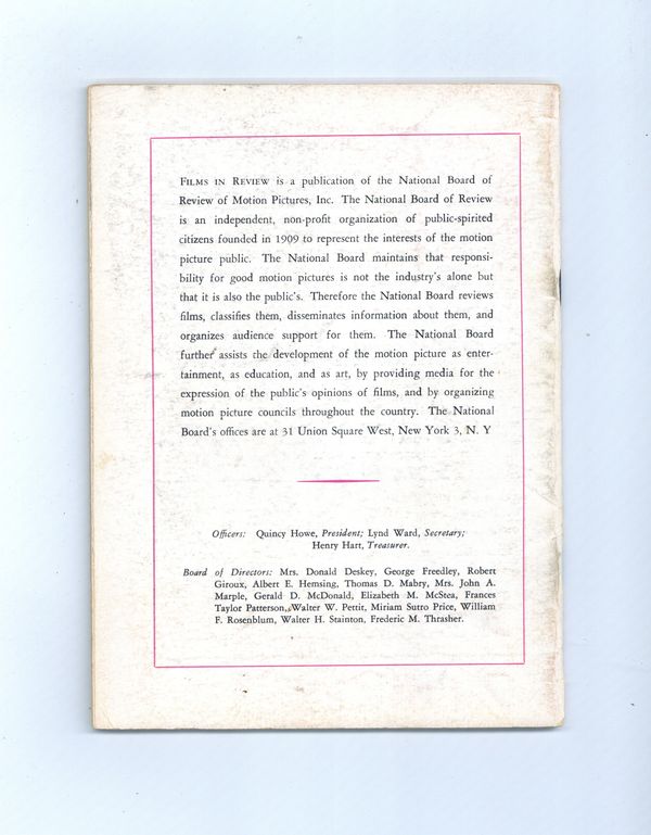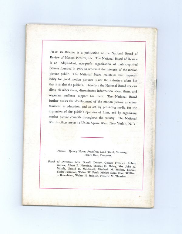 Film in Review is a publication of the National Board of Review of Motion Pictures, Inc, an independent, non-profit organization of public citizens founded in 1909 to represent the interests of the motion picture public. This National Board further assists the development of the motion picture as a source of entertainment, as education, and as art, by providing media for the expression of the public's opinion about films and their cultural and social effects. 5 1/2-in. x 7 1/2-in., 52 pages, B&W. Cover price $0.50.