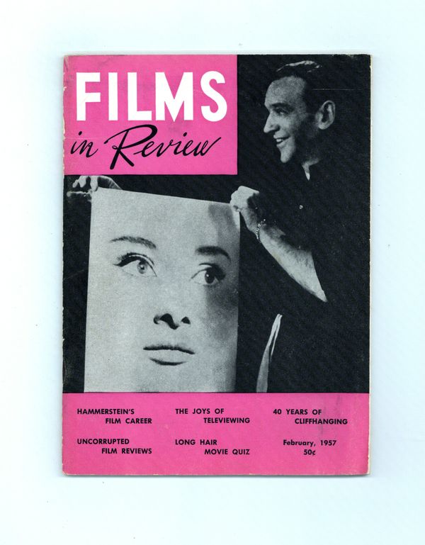 Published Feb 1957 by National Board of Review of Motion Pictures Inc..$5.40Film in Review is a publication of the National Board of Review of Motion Pictures, Inc, an independent, non-profit organization of public citizens founded in 1909 to represent the interests of the motion picture public. This National Board further assists the development of the motion picture as a source of entertainment, as education, and as art, by providing media for the expression of the public's opinion about films and their cultural and social effects. 5 1/2-in. x 7 1/2-in., 52 pages, B&W. Cover price $0.50.