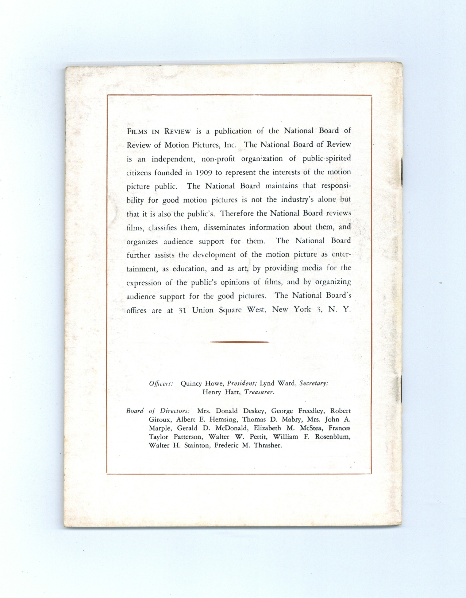 Published Jan 1958 by National Board of Review of Motion Pictures Inc..$5.00Film in Review is a publication of the National Board of Review of Motion Pictures, Inc, an independent, non-profit organization of public citizens founded in 1909 to represent the interests of the motion picture public. This National Board further assists the development of the motion picture as a source of entertainment, as education, and as art, by providing media for the expression of the public's opinion about films and their cultural and social effects. 5 1/2-in. x 7 1/2-in., 52 pages, B&W. Cover price $0.50.