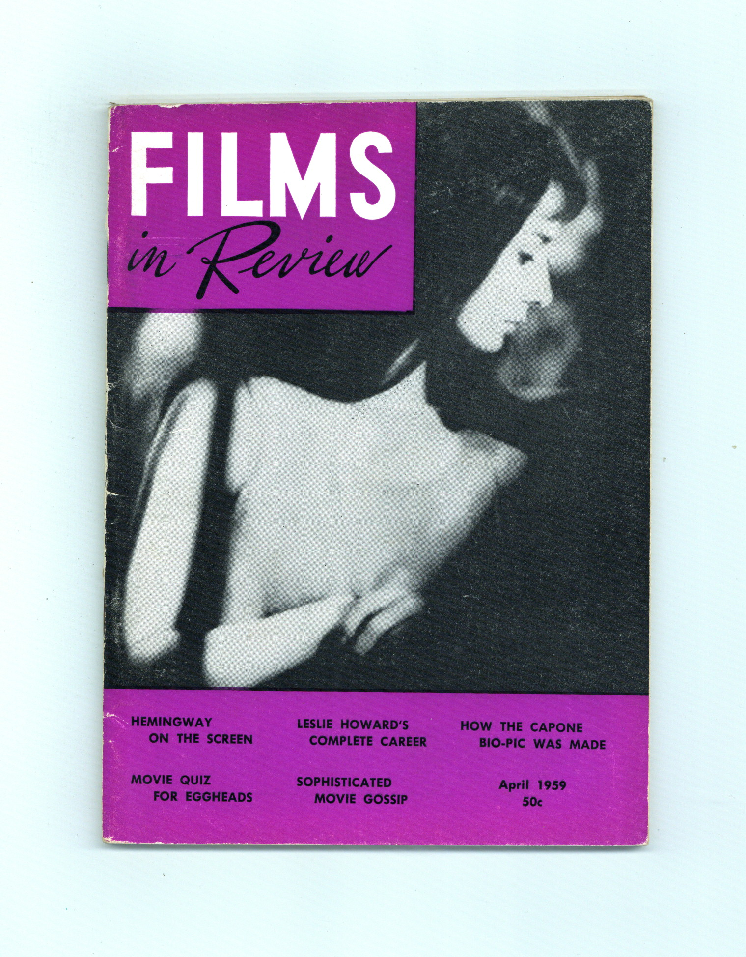 Published Apr 1959 by National Board of Review of Motion Pictures Inc..$20.50Film in Review is a publication of the National Board of Review of Motion Pictures, Inc, an independent, non-profit organization of public citizens founded in 1909 to represent the interests of the motion picture public. This National Board further assists the development of the motion picture as a source of entertainment, as education, and as art, by providing media for the expression of the public's opinion about films and their cultural and social effects. 5 1/2-in. x 7 1/2-in., 68 pages, B&W. Cover price $0.50.