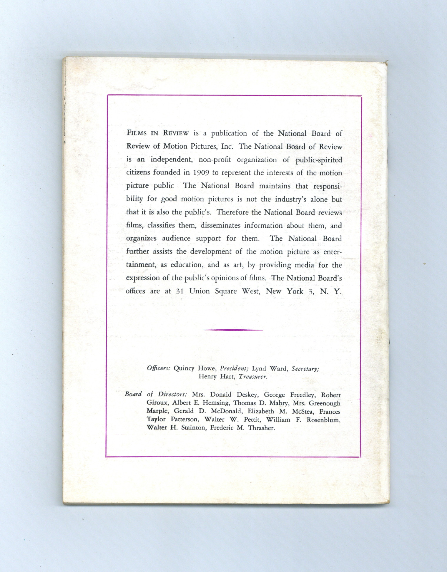 Film in Review is a publication of the National Board of Review of Motion Pictures, Inc, an independent, non-profit organization of public citizens founded in 1909 to represent the interests of the motion picture public. This National Board further assists the development of the motion picture as a source of entertainment, as education, and as art, by providing media for the expression of the public's opinion about films and their cultural and social effects. 5 1/2-in. x 7 1/2-in., 68 pages, B&W. Cover price $0.50.