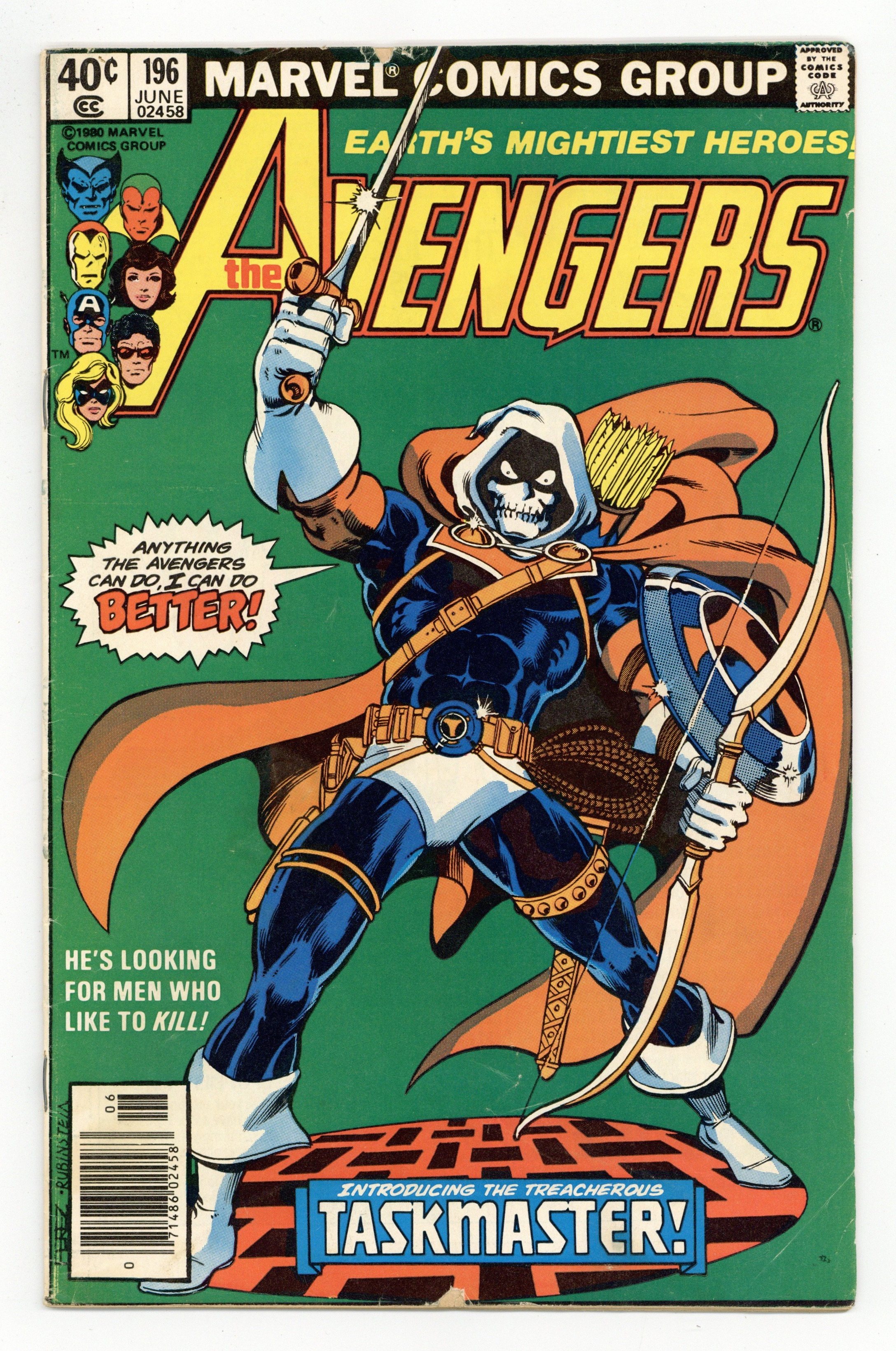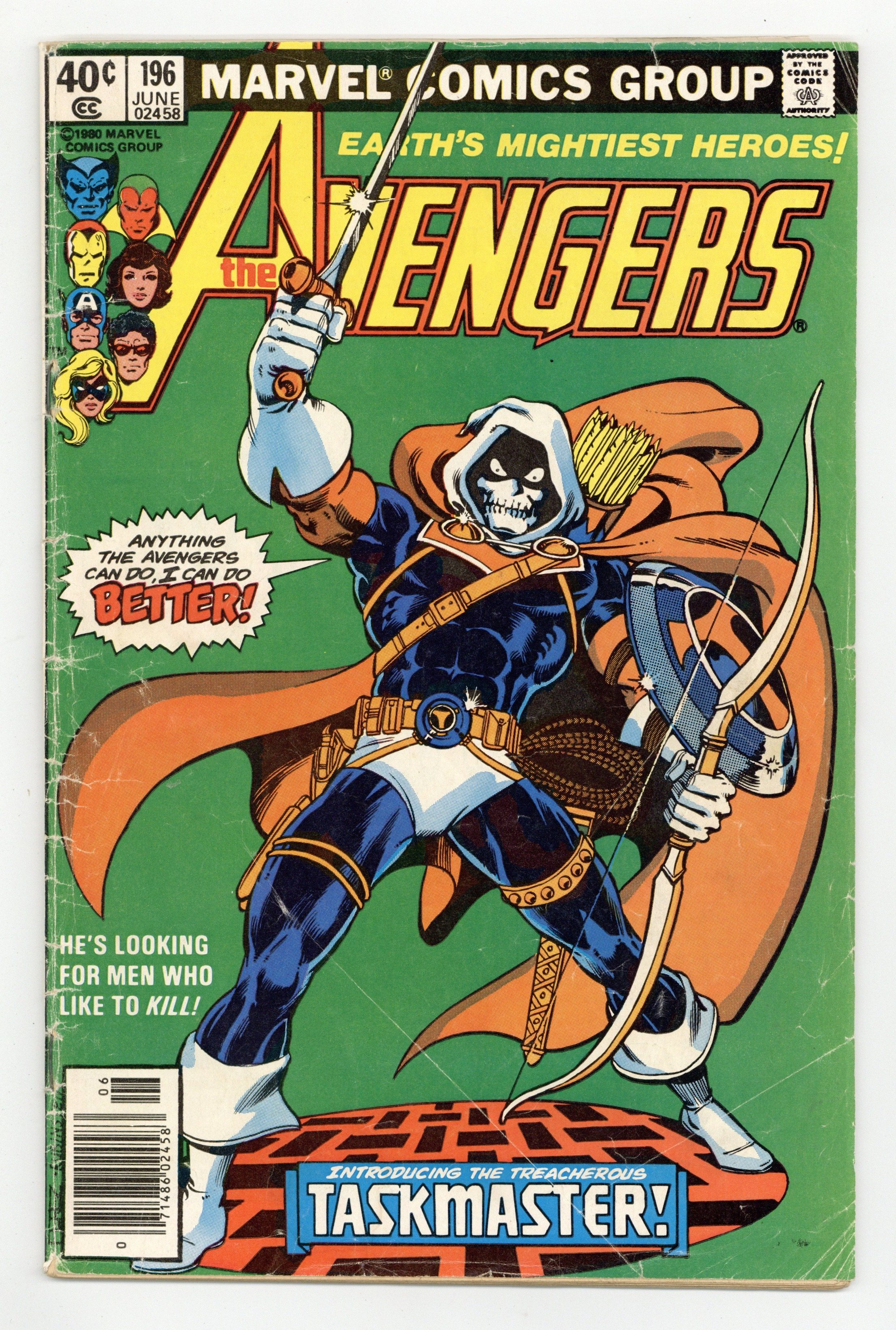 Newsstand Edition. "The Terrible Toll of the Taskmaster" Guest-starring Ant-Man. Script by David Michelinie. Pencils by George Perez. Inks by Jack Abel. Cover by George Perez and Joe Rubinstein. A brand new villain, the Taskmaster, has turned the tables on the Wasp, Yellowjacket, and Ant-Man! The three insect-like super-heroes are prisoners inside the Taskmaster's training academy! The good news is that seven avengers are waiting outside the training compound, but the bad news...none of them know that their teammates are in grave danger! However, Earth Mightiest Heroes follow the ants, and the trail leads to the Taskmaster! Is the villain with the photographic reflexes ready to battle the Avengers? Choose wisely dear Taskmaster! First (full) appearance and origin of the Taskmaster. (Notes: The Taskmaster appears next in Marvel Team-Up 103. The letters page includes a letter from comics writer Kurt Busiek.) 36 pages Cover price $0.40.