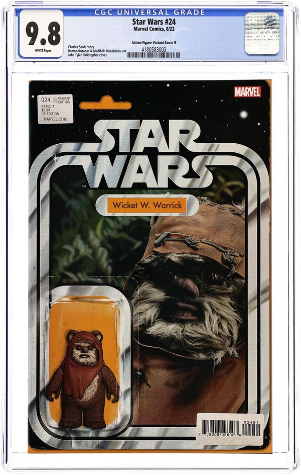 "Wicket W. Warrick" Variant Cover by John Tyler Christopher. Written by Charles Soule. Art by Ramon Rosanas. "THE FINAL HUNT!" COMMANDER ELLIAN ZAHRA, former protégé of GRAND MOFF WILHUFF TARKIN, has used brilliant tactics and savage brutality to nearly eradicate the Rebel fleet. Now she and her final target, GENERAL LEIA ORGANA, will hunt each other across a wild planet...to the bitter end. 28 pages, full color. Rated T Cover price $3.99.