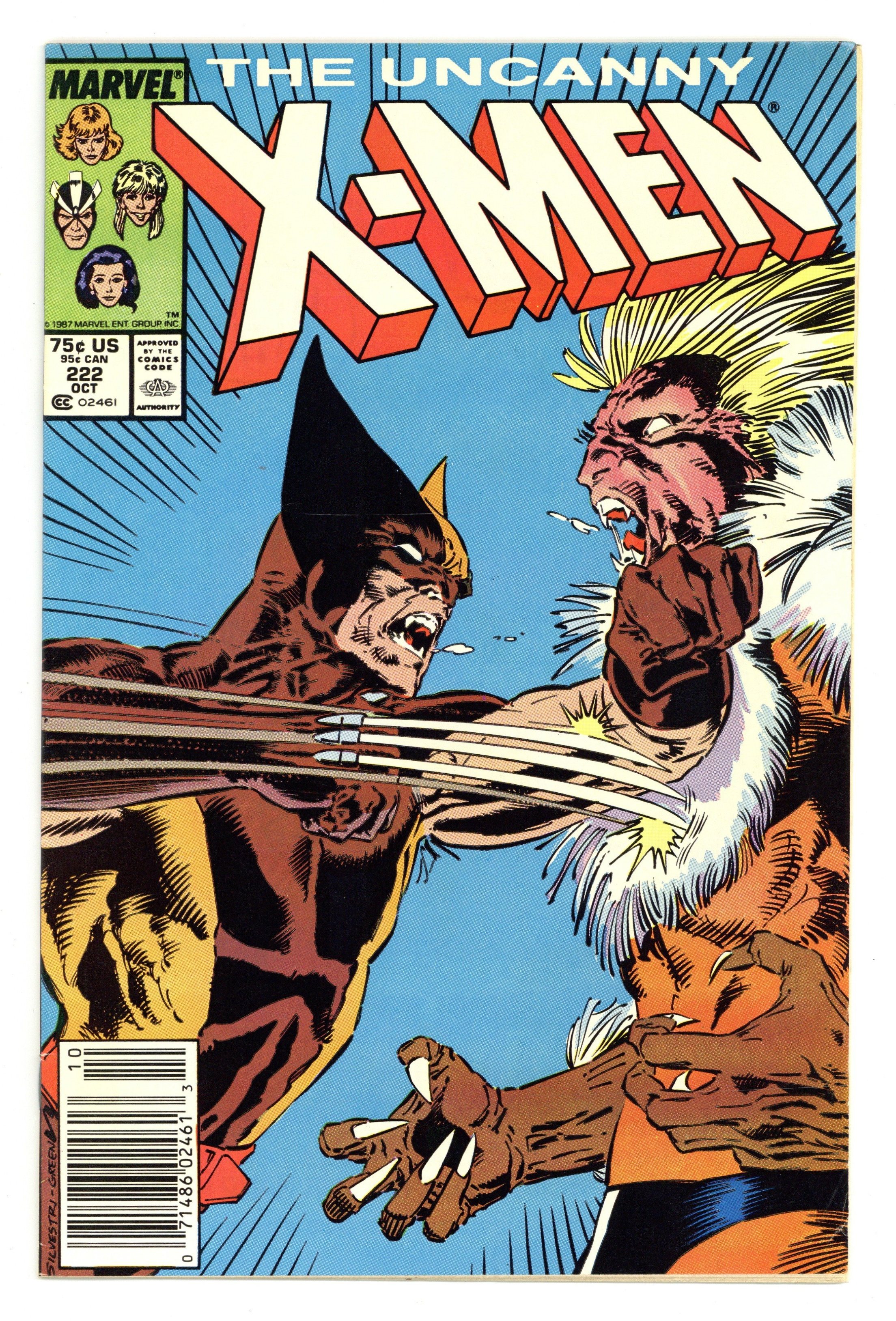 Tags: Sabretooth, X-Men$12.00Newsstand Edition. "Heartbreak!" Part 2 of 2. Story by Chris Claremont. Art by Marc Silvestri and Dan Green. The battle between the Uncanny X-Men and the deadly Marauders continues at the Golden Gate Bridge. They fight for the future of Cyclops' estranged wife Madelyne. Meanwhile, Storm and the shaman Naze continue their desperate quest. But our they doomed to fail when they come face-to-face with the sinister Eye Killers?! 36 pgs. Cover price $0.75.