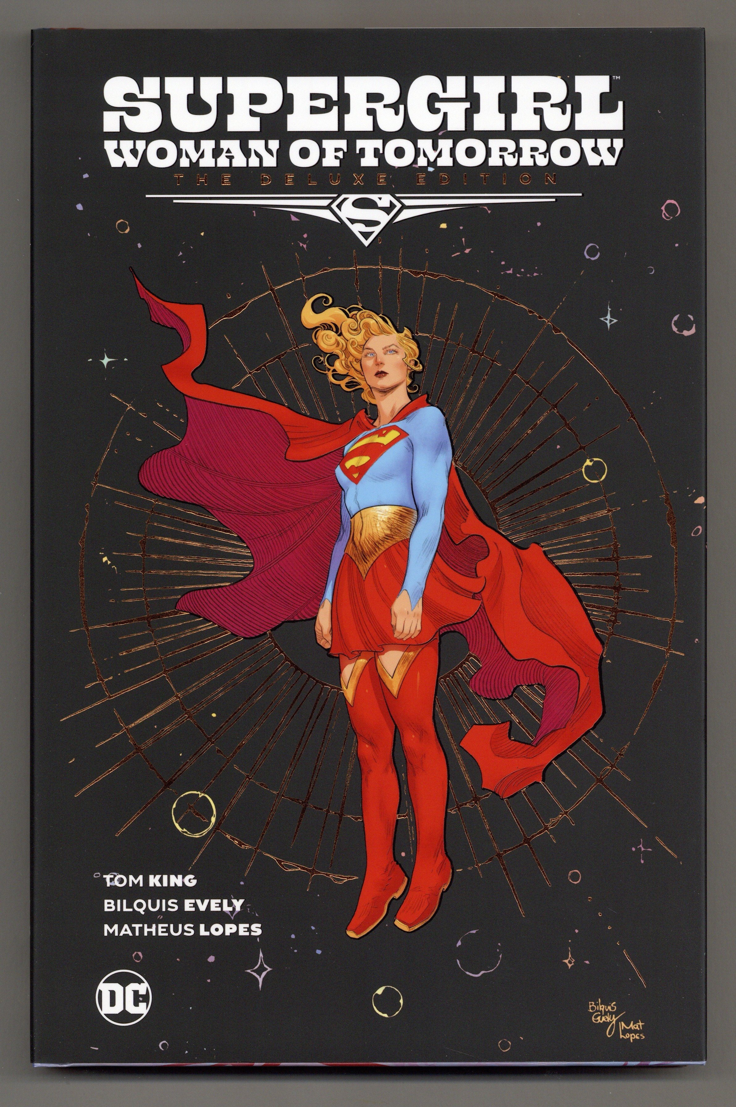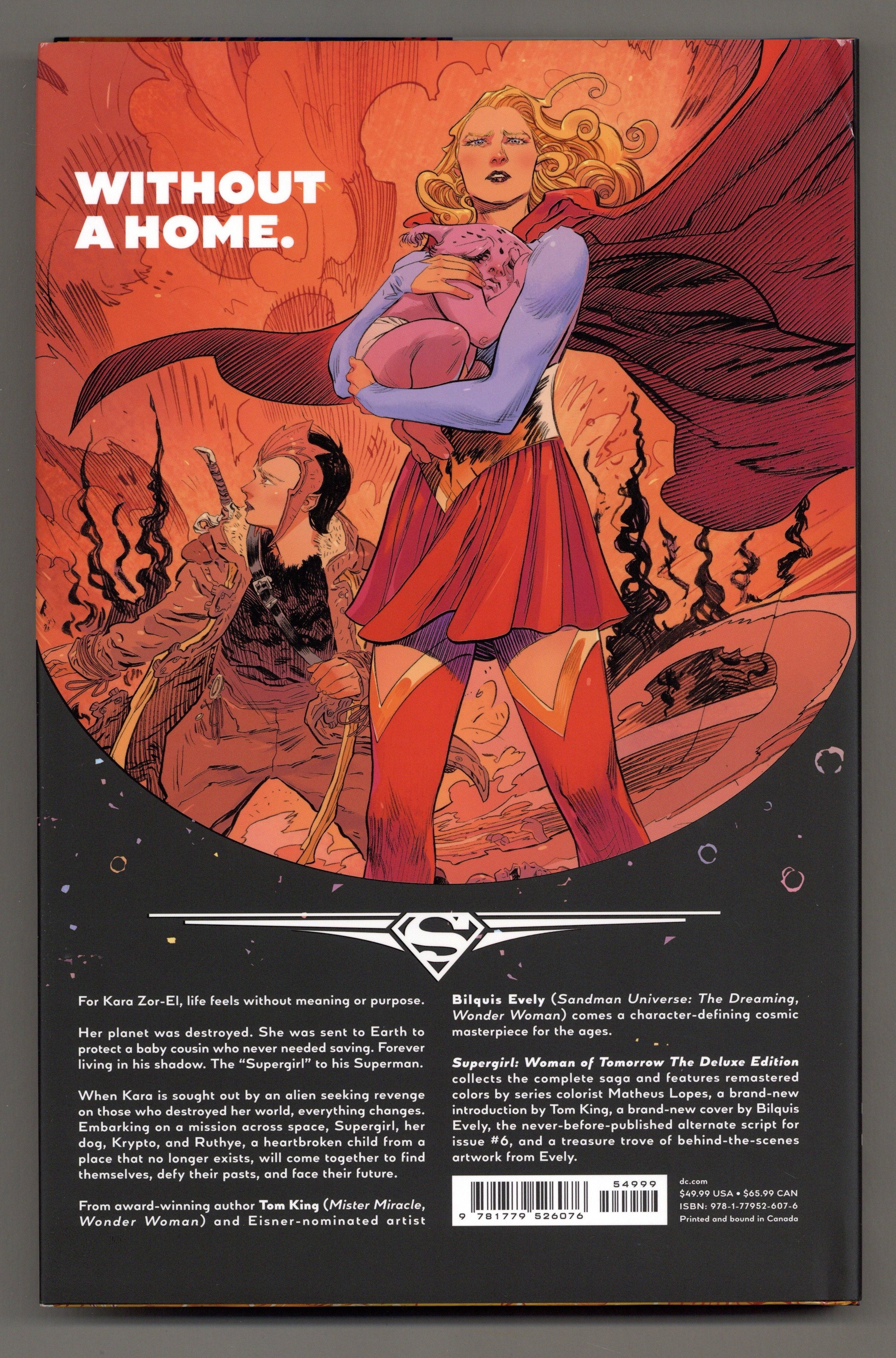 1st printing. Collects Supergirl: Woman of Tomorrow (2021 DC ) #1-8. Written by Tom King. Art and cover by Bilquis Evely and Matheus Lopes. Her planet was destroyed. Sent to Earth to protect a baby cousin who never needed saving. Forever living in his shadow. The Supergirl to his Superman. But when Kara is sought out by an alien seeking revenge on those who destroyed her world, everything changes. She will need to embark on a mission across space to find herself, defy her pasts, and face her future. From Tom King and Bilquis Evely comes a character-defining cosmic masterpiece for the ages. Supergirl: Woman of Tomorrow The Deluxe Edition collects the complete saga (issues #1-8) and features a brand-new introduction by Tom King, a brand-new cover by Bilquis Evely, the never-before-published alternate script for issue #6, and a treasure trove of behind-the-scenes artwork from Evely. Hardcover, 264 pages, full color. Cover price $49.99.