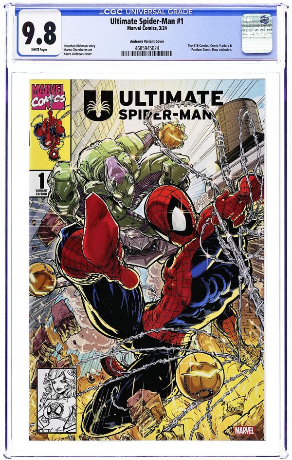 The 616 Comics, Comic Traders, and Fandom Comic Shop Joint Exclusive Cover by Kaare Andrews. Written by Jonathan Hickman. Art by Marco Checchetto. THE NEW ULTIMATE SPIDER-MAN FOR A NEW ULTIMATE UNIVERSE!Visionary writer Jonathan Hickman (HOUSE OF X/POWERS OF X) and acclaimed artist Marco Checchetto (DAREDEVIL) bring you a bold new take on Spider-Man, with this, the debut title of the new line of Ultimate Comics! After the events of ULTIMATE INVASION, the world needs a hero...who will rise up to take on that responsibility? Prepare to be entangled in a web of mystery and excitement as the all-new ULTIMATE SPIDER-MAN comic redefines the wall-crawler for the 21st Century! 48 pages, full color. Rated T