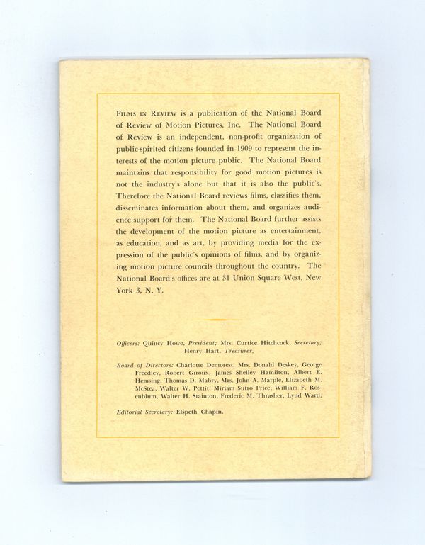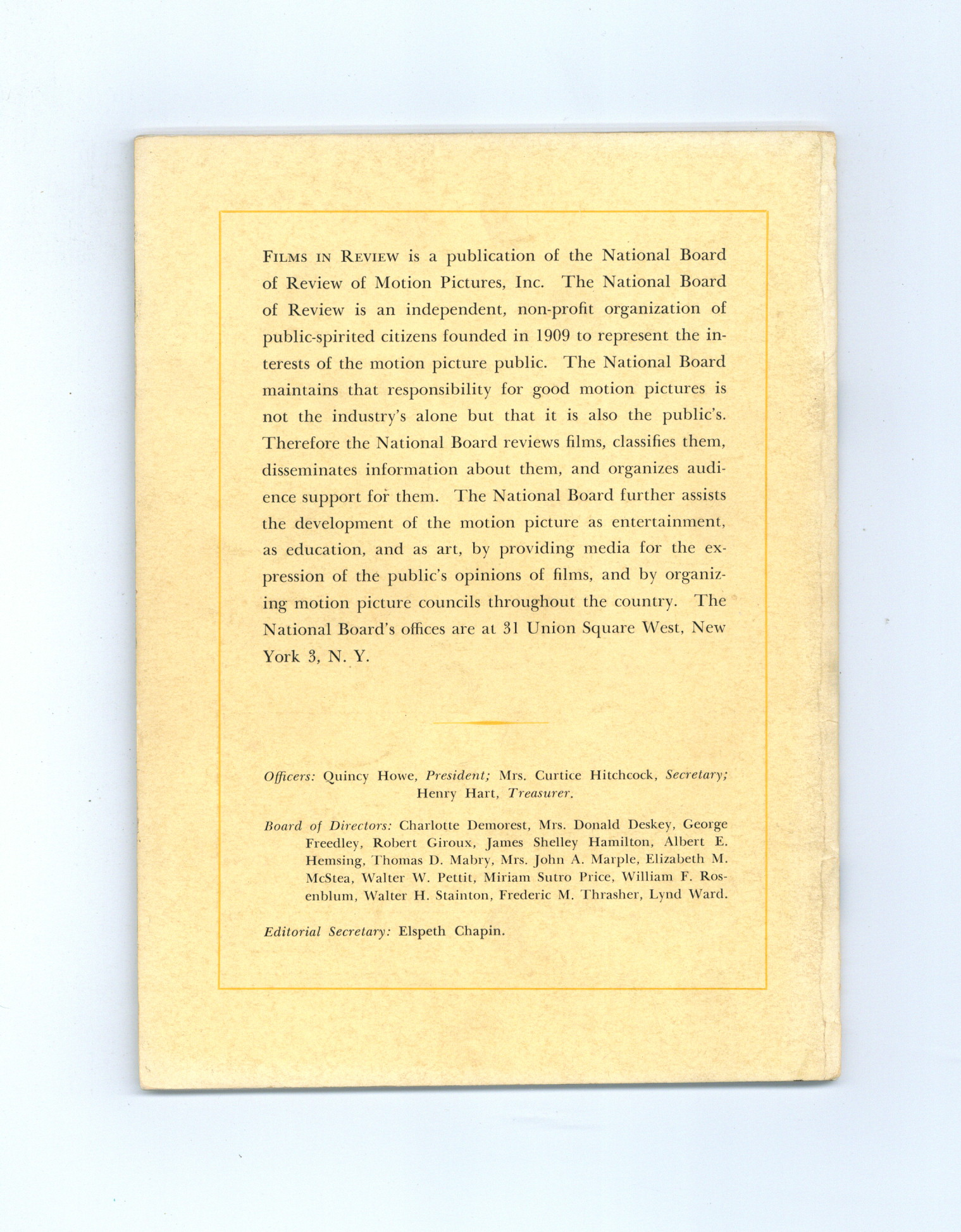 Film in Review is a publication of the National Board of Review of Motion Pictures, Inc, an independent, non-profit organization of public citizens founded in 1909 to represent the interests of the motion picture public. This National Board further assists the development of the motion picture as a source of entertainment, as education, and as art, by providing media for the expression of the public's opinion about films and their cultural and social effects. 5 1/2-in. x 7 1/2-in., 52 pages, B&W. Cover price $0.35.