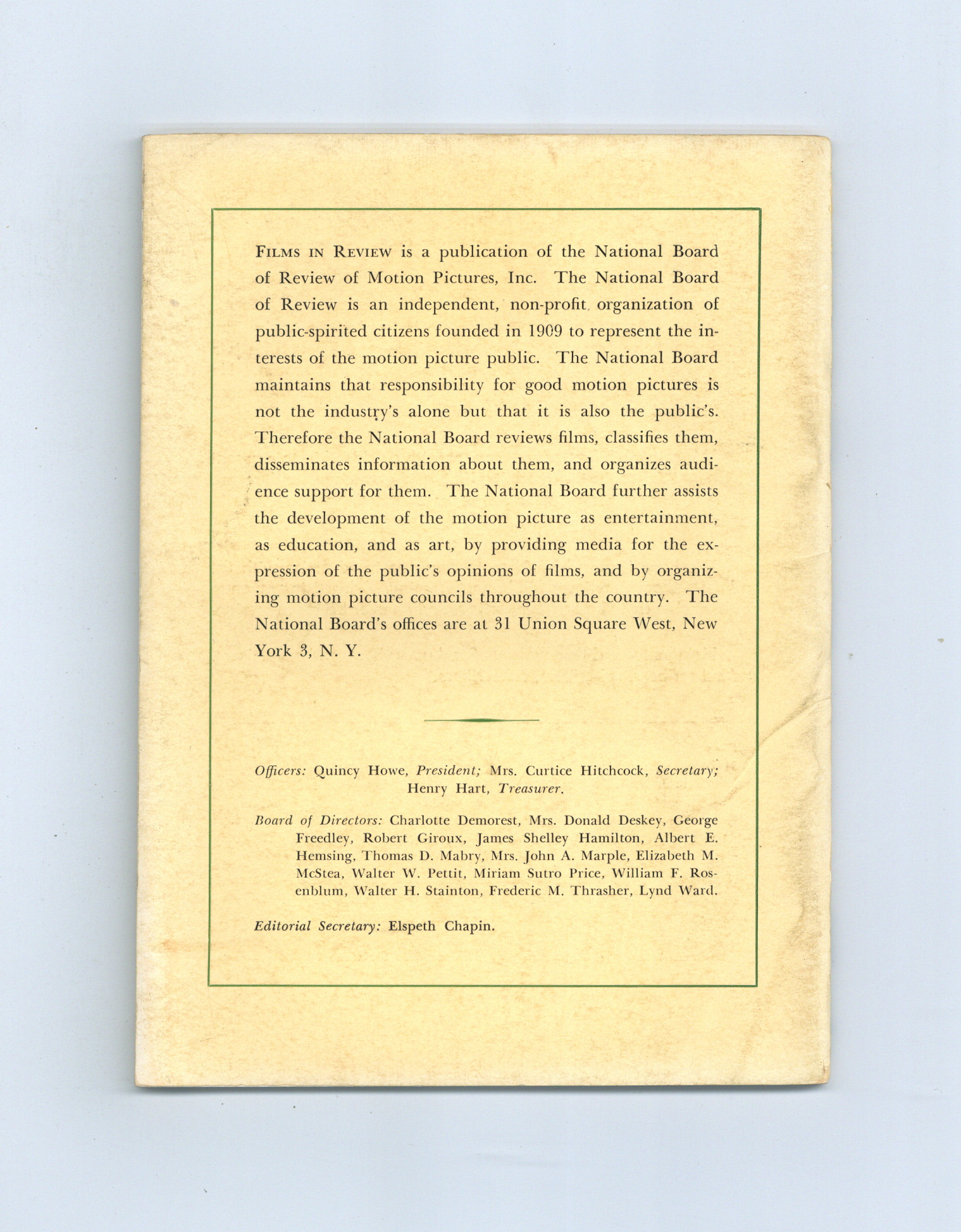 Published Jun 1953 by National Board of Review of Motion Pictures Inc..$10.75- Staple rust: Slight.