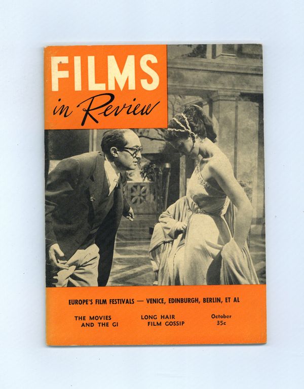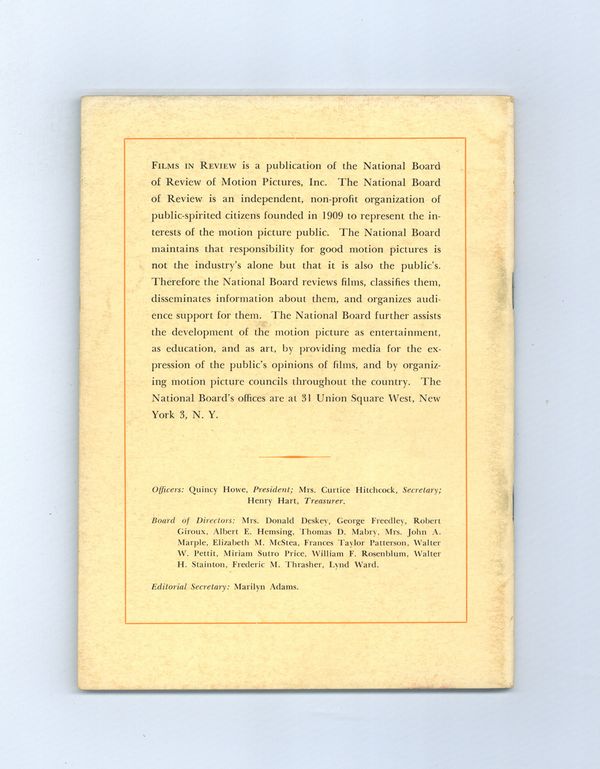 Published Oct 1953 by National Board of Review of Motion Pictures Inc..$20.50Film in Review is a publication of the National Board of Review of Motion Pictures, Inc, an independent, non-profit organization of public citizens founded in 1909 to represent the interests of the motion picture public. This National Board further assists the development of the motion picture as a source of entertainment, as education, and as art, by providing media for the expression of the public's opinion about films and their cultural and social effects. 5 1/2-in. x 7 1/2-in., 52 pages, B&W. Cover price $0.35.