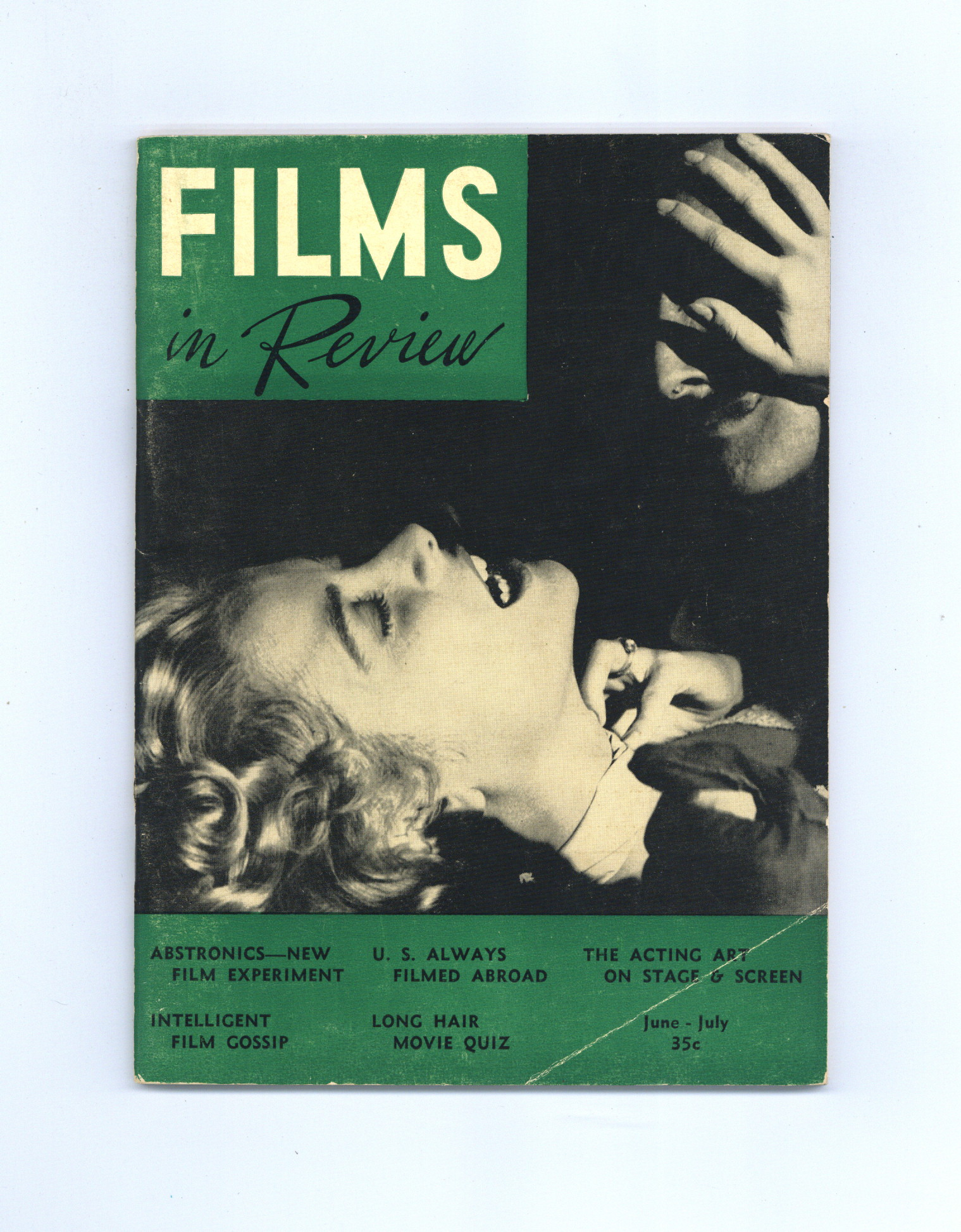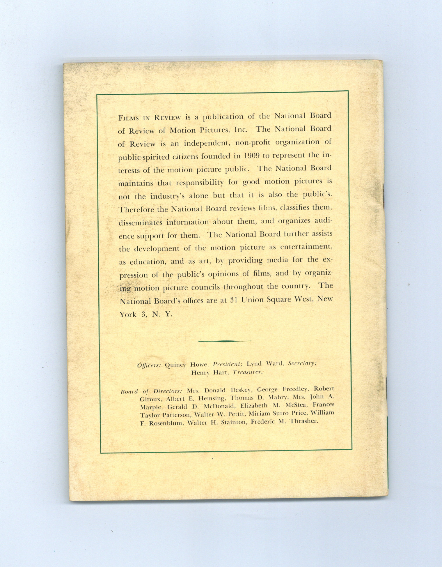 Published Jun 1954 by National Board of Review of Motion Pictures Inc..$10.75Film in Review is a publication of the National Board of Review of Motion Pictures, Inc, an independent, non-profit organization of public citizens founded in 1909 to represent the interests of the motion picture public. This National Board further assists the development of the motion picture as a source of entertainment, as education, and as art, by providing media for the expression of the public's opinion about films and their cultural and social effects. 5 1/2-in. x 7 1/2-in., 52 pages, B&W. Cover price $0.35.