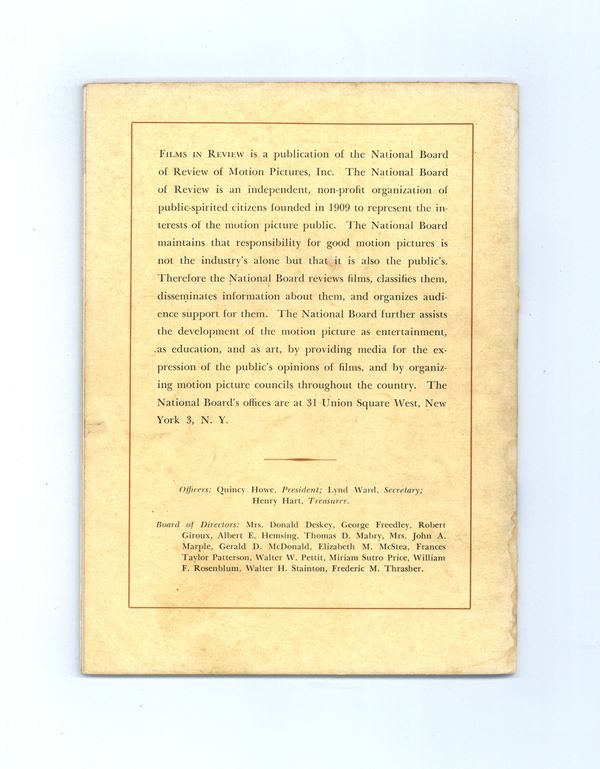Film in Review is a publication of the National Board of Review of Motion Pictures, Inc, an independent, non-profit organization of public citizens founded in 1909 to represent the interests of the motion picture public. This National Board further assists the development of the motion picture as a source of entertainment, as education, and as art, by providing media for the expression of the public's opinion about films and their cultural and social effects. 5 1/2-in. x 7 1/2-in., 52 pages, B&W. Cover price $0.35.