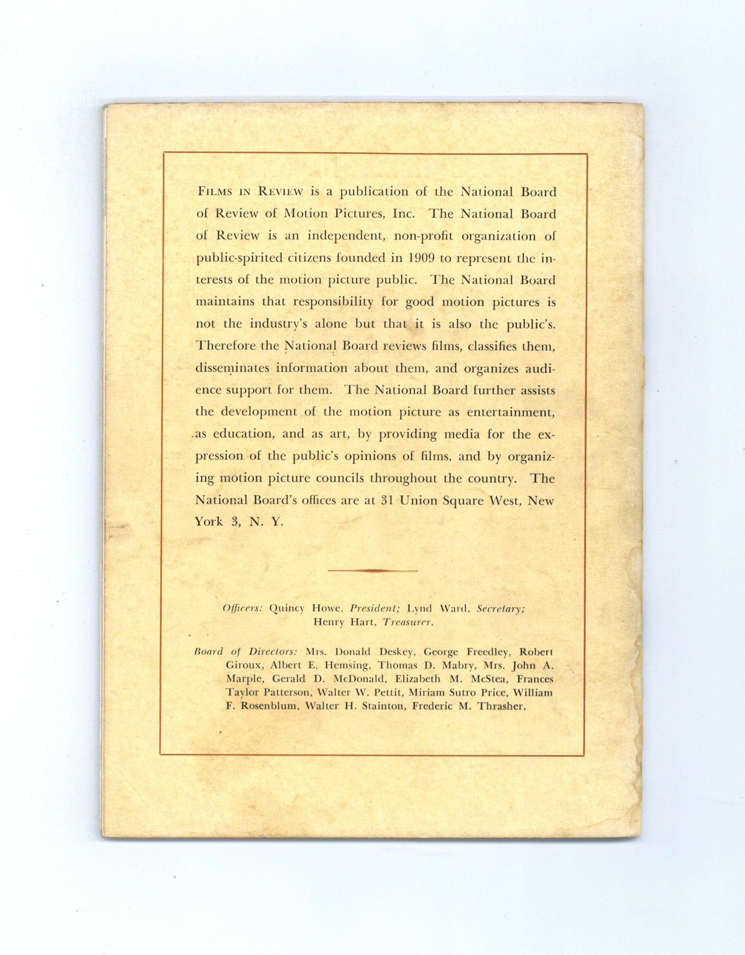 Published Nov 1954 by National Board of Review of Motion Pictures Inc..$20.50- Staple rust: Slight.