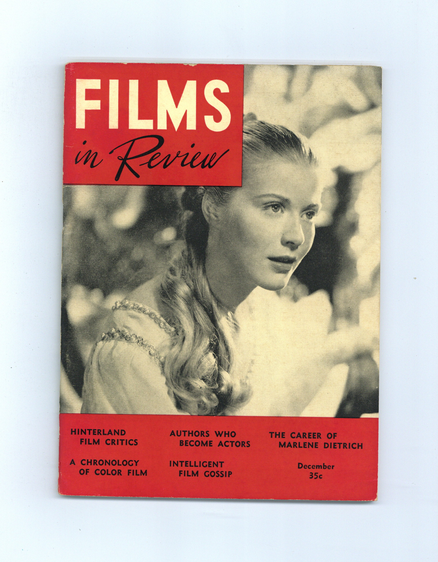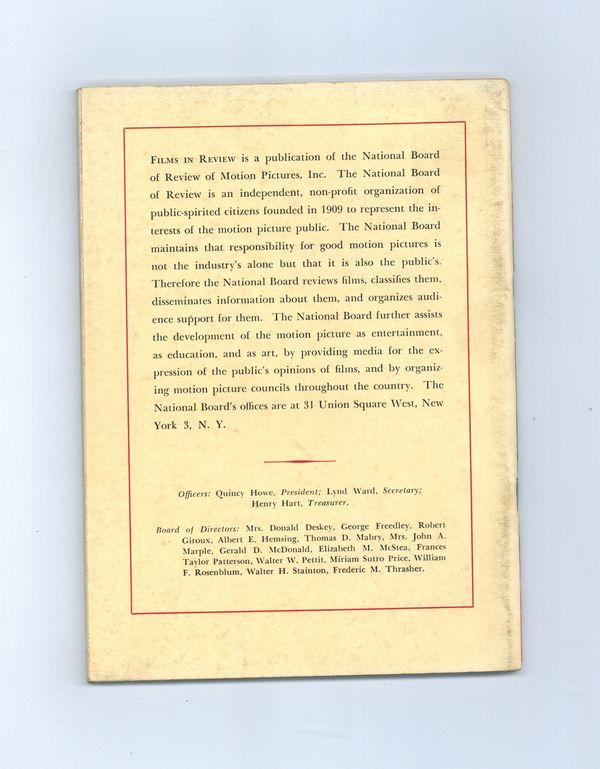 Film in Review is a publication of the National Board of Review of Motion Pictures, Inc, an independent, non-profit organization of public citizens founded in 1909 to represent the interests of the motion picture public. This National Board further assists the development of the motion picture as a source of entertainment, as education, and as art, by providing media for the expression of the public's opinion about films and their cultural and social effects. 5 1/2-in. x 7 1/2-in., 52 pages, B&W. Cover price $0.35.